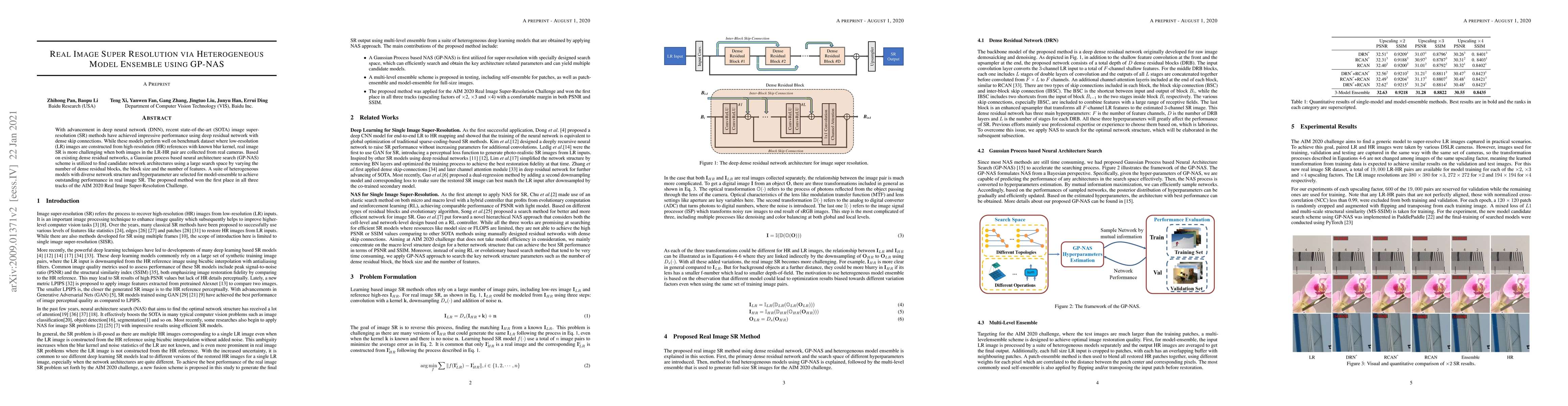This paper proposes a method for real image super resolution using a heterogeneous model ensemble found via Gaussian process based neural architecture search (GP-NAS). The ensemble of diverse networks achieves superior performance on real images, outperforming other methods in the AIM 2020 Real Image Super-Resolution Challenge.
