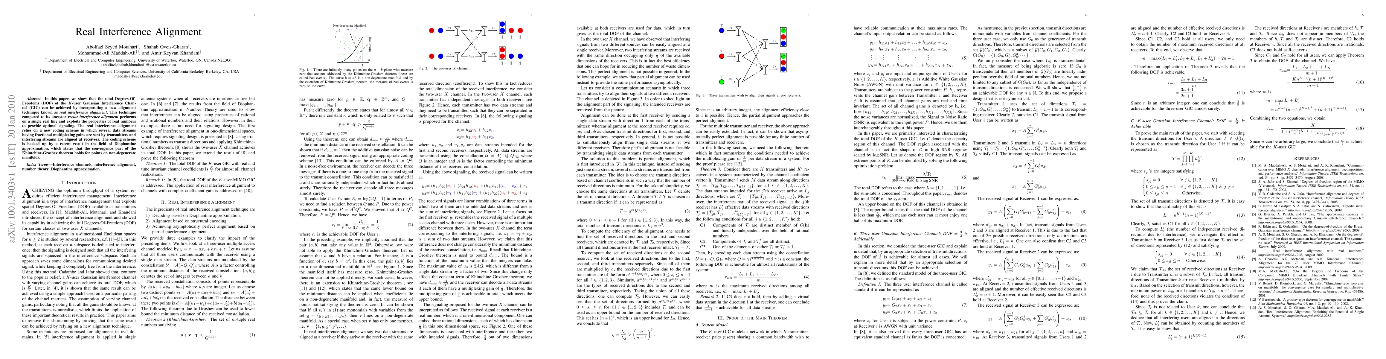 In this paper, we show that the total Degrees-Of-Freedoms (DOF) of the $K$-user Gaussian Interference Channel (GIC) can be achieved by incorporating a new alignment technique known as \emph{real interference alignment}. This technique compared to its ancestor \emph{vector interference alignment} performs on a single real line and exploits the properties of real numbers to provide optimal signaling. The real interference alignment relies on a new coding scheme in which several data streams having fractional multiplexing gains are sent by transmitters and interfering streams are aligned at receivers. The coding scheme is backed up by a recent result in the field of Diophantine approximation, which states that the convergence part of the Khintchine-Groshev theorem holds for points on non-degenerate manifolds.