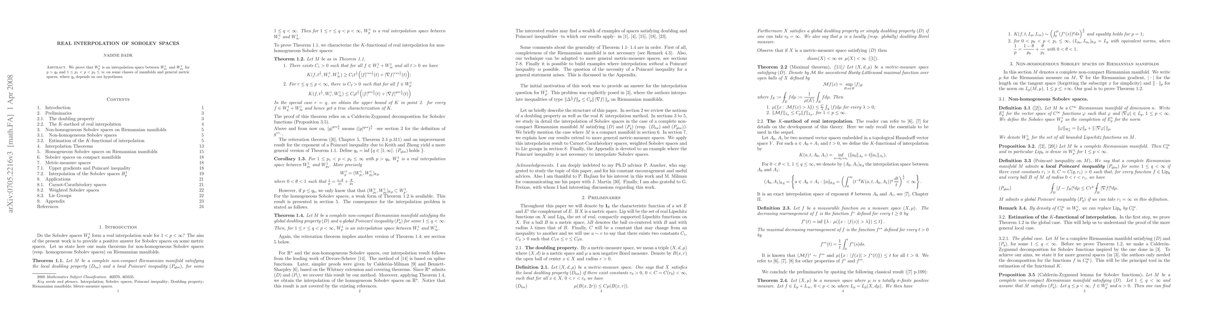 This research proves that certain Sobolev spaces, specifically W^1_p, act as interpolation spaces between W^1_p1 and W^1_p2 under specific conditions on p, p1, p2, applicable to certain manifolds and metric spaces, with a dependency on q0 based on hypotheses.