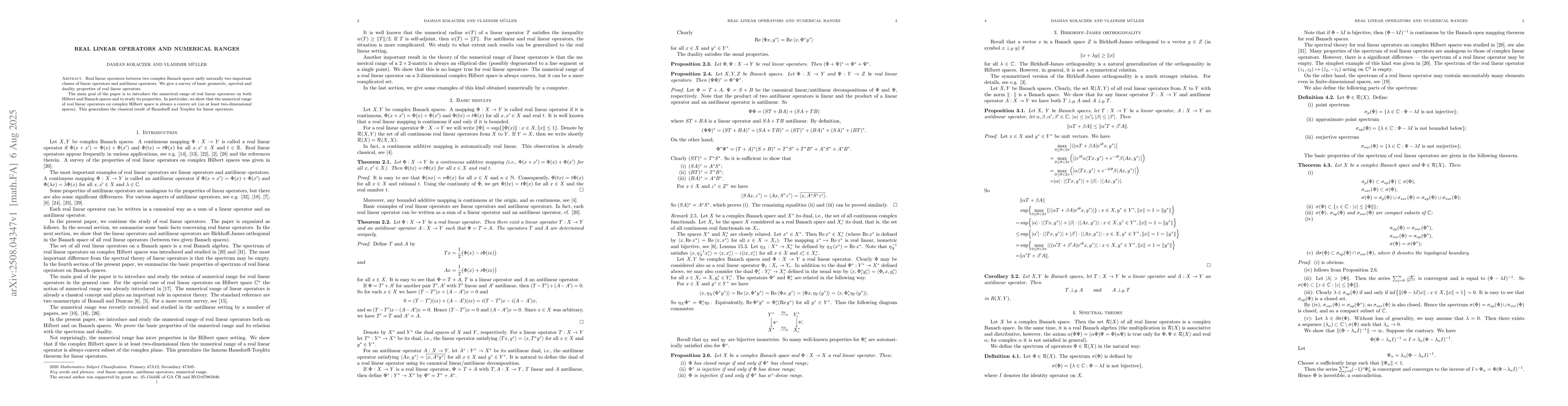 Real linear operators between two complex Banach spaces unify naturally two important classes of linear operators and antilinear operators. We give a survey of basic geometric, spectral and duality properties of real linear operators. The main goal of the paper is to introduce the numerical range of real linear operators on both Hilbert and Banach spaces and to study its properties. In particular, we show that the numerical range of real linear operators on complex Hilbert space is always a convex set (on at least two-dimensional spaces). This generalizes the classical result of Hausdorff and Toeplitz for linear operators.