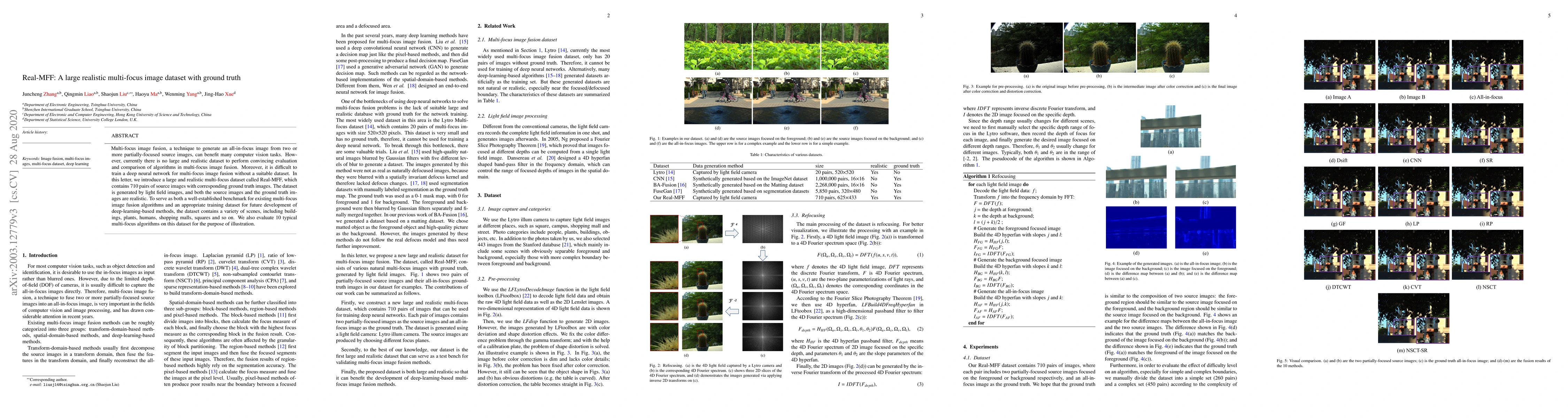 The Real-MFF dataset introduces a large, realistic multi-focus image fusion dataset with 710 pairs of source images and corresponding ground truth, aiming to provide a benchmark for evaluating and training algorithms in multi-focus image fusion. The dataset includes diverse scenes and evaluates 10 typical algorithms to demonstrate its utility.
