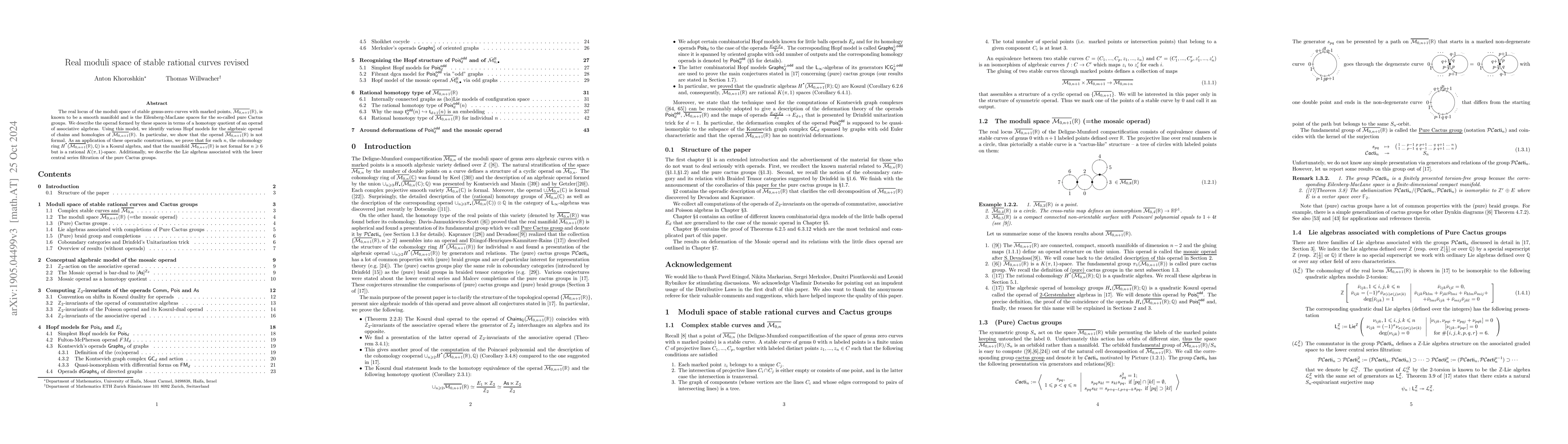 We give a description of the operad formed by the real locus of the moduli space of stable genus zero curves with marked points $\overline{{\mathcal M}_{0,{n+1}}}({\mathbb R})$ in terms of a homotopy quotient of an operad of associative algebras. We use this model to find different Hopf models of the algebraic operad of Chains and homologies of $\overline{{\mathcal M}_{0,{n+1}}}({\mathbb R})$. In particular, we show that the operad $\overline{{\mathcal M}_{0,{n+1}}}({\mathbb R})$ is not formal. The manifolds $\overline{{\mathcal M}_{0,{n+1}}}({\mathbb R})$ are known to be Eilenberg-MacLane spaces for the so called pure Cacti groups. As an application of the operadic constructions we prove that for each $n$ the cohomology ring $H(\overline{{\mathcal M}_{0,{n+1}}}({\mathbb R}),{\mathbb{Q}})$ is a Koszul algebra and that the manifold $\overline{{\mathcal M}_{0,{n+1}}}({\mathbb R})$ is not formal but is a rational $K(\pi,1)$ space. We give the description of the Lie algebras associated with the lower central series filtration of the pure Cacti groups.