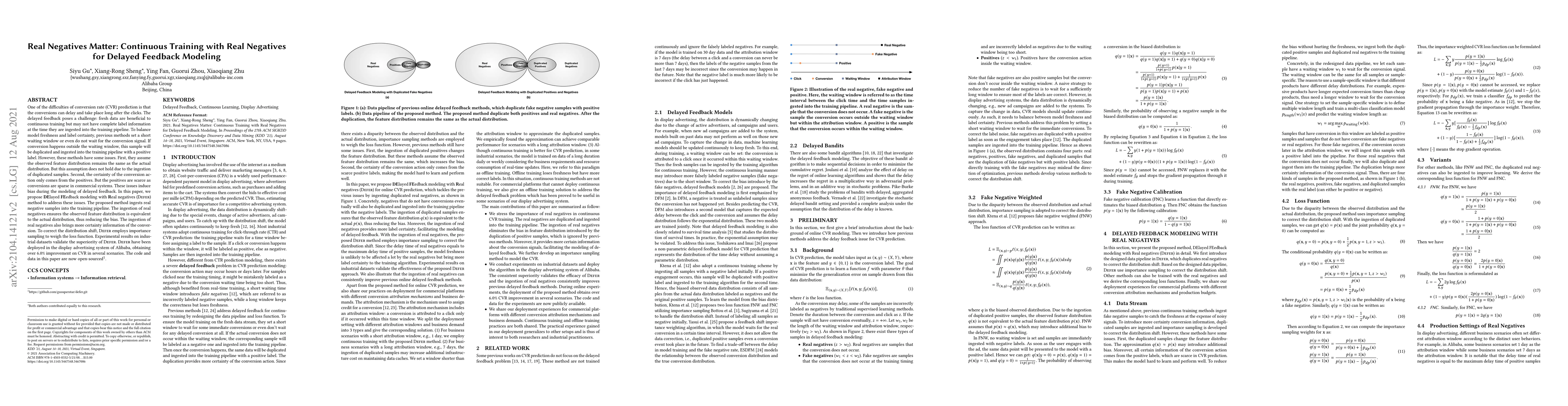 One of the difficulties of conversion rate (CVR) prediction is that the conversions can delay and take place long after the clicks. The delayed feedback poses a challenge: fresh data are beneficial to continuous training but may not have complete label information at the time they are ingested into the training pipeline. To balance model freshness and label certainty, previous methods set a short waiting window or even do not wait for the conversion signal. If conversion happens outside the waiting window, this sample will be duplicated and ingested into the training pipeline with a positive label. However, these methods have some issues. First, they assume the observed feature distribution remains the same as the actual distribution. But this assumption does not hold due to the ingestion of duplicated samples. Second, the certainty of the conversion action only comes from the positives. But the positives are scarce as conversions are sparse in commercial systems. These issues induce bias during the modeling of delayed feedback. In this paper, we propose DElayed FEedback modeling with Real negatives (DEFER) method to address these issues. The proposed method ingests real negative samples into the training pipeline. The ingestion of real negatives ensures the observed feature distribution is equivalent to the actual distribution, thus reducing the bias. The ingestion of real negatives also brings more certainty information of the conversion. To correct the distribution shift, DEFER employs importance sampling to weigh the loss function. Experimental results on industrial datasets validate the superiority of DEFER. DEFER have been deployed in the display advertising system of Alibaba, obtaining over 6.0% improvement on CVR in several scenarios. The code and data in this paper are now open-sourced {https://github.com/gusuperstar/defer.git}.