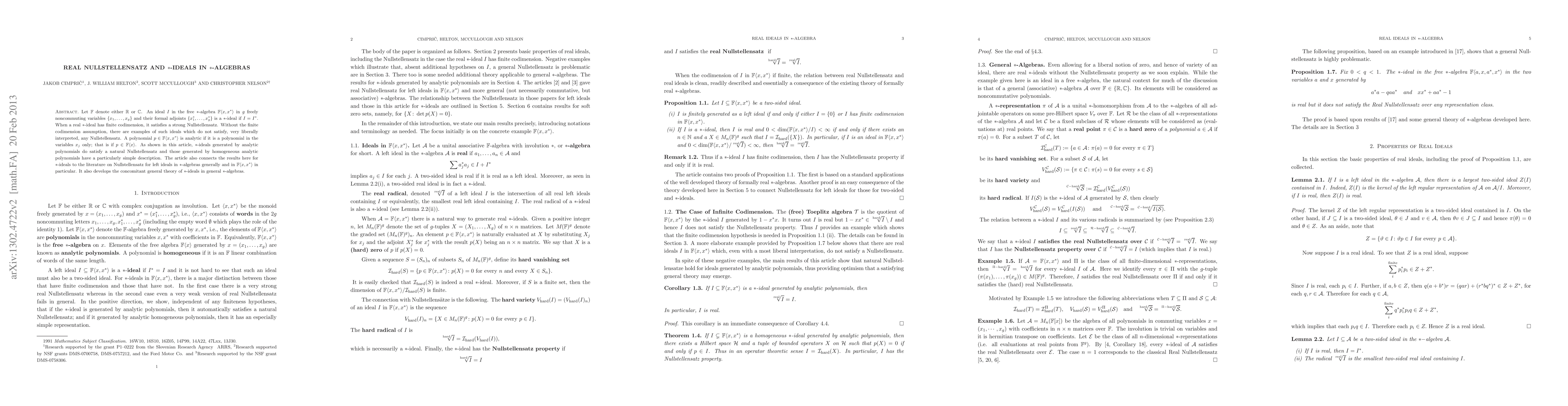 This paper explores *-ideals in *-algebras, particularly focusing on real *-ideals in the free *-algebra F<x,x*> with noncommuting variables. It establishes a strong Nullstellensatz for real *-ideals of finite codimension and shows that *-ideals generated by analytic polynomials satisfy a natural Nullstellensatz.