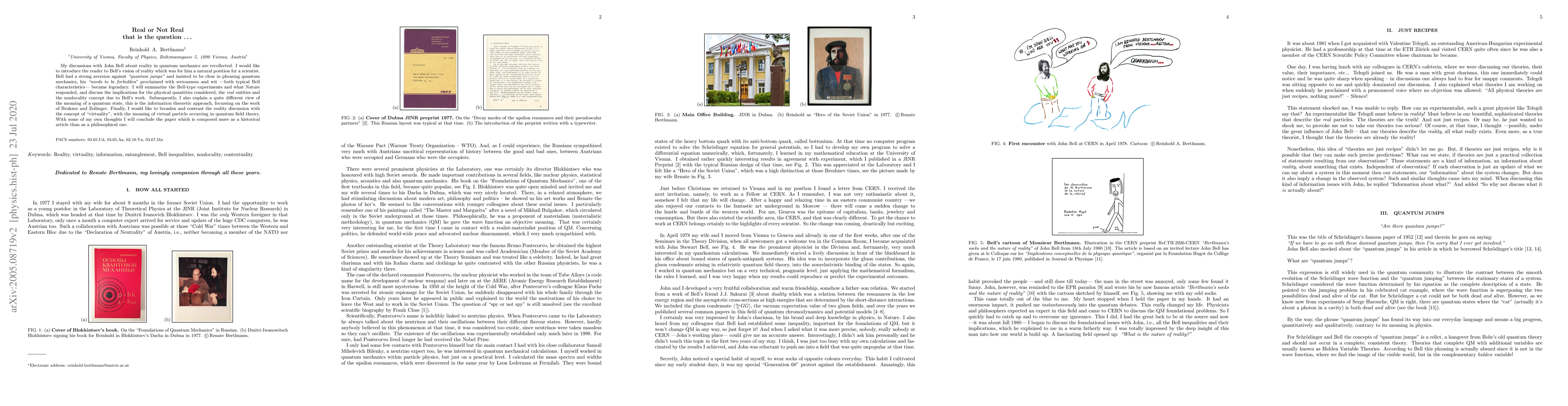 The paper recounts discussions with John Bell on quantum mechanics reality, highlighting his opposition to 'quantum jumps' and preference for clear phrasing. It summarizes Bell-type experiments and their implications for real entities and nonlocality. The paper also contrasts Bell's view with the information-theoretic approach, focusing on Brukner and Zeilinger's work, and relates the reality discussion to the concept of 'virtuality' in quantum field theory.