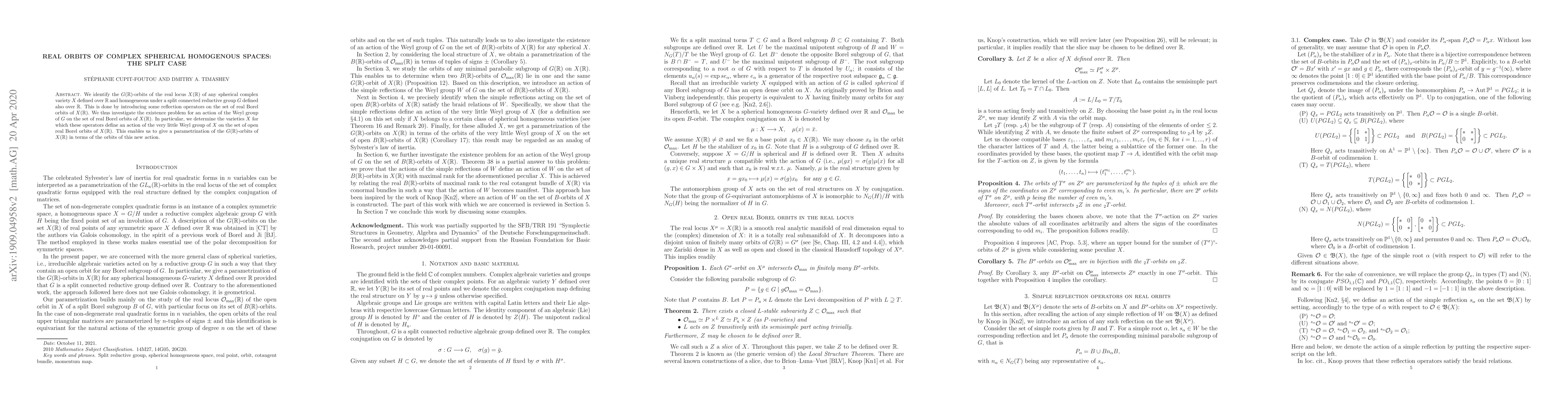We identify the $G(\mathbb R)$-orbits of the real locus $X(\mathbb R)$ of any spherical complex variety $X$ defined over $\mathbb R$ and homogeneous under a split connected reductive group $G$ defined also over $\mathbb R$. This is done by introducing some reflection operators on the set of real Borel orbits of $X(\mathbb R)$. We thus investigate the existence problem for an action of the Weyl group of $G$ on the set of real Borel orbits of $X(\mathbb R)$. In particular, we determine the varieties $X$ for which these operators define an action of the very little Weyl group of $X$ on the set of open real Borel orbits of $X(\mathbb R)$. This enables us to give a parametrization of the $G(\mathbb R)$-orbits of $X(\mathbb R)$ in terms of the orbits of this new action.