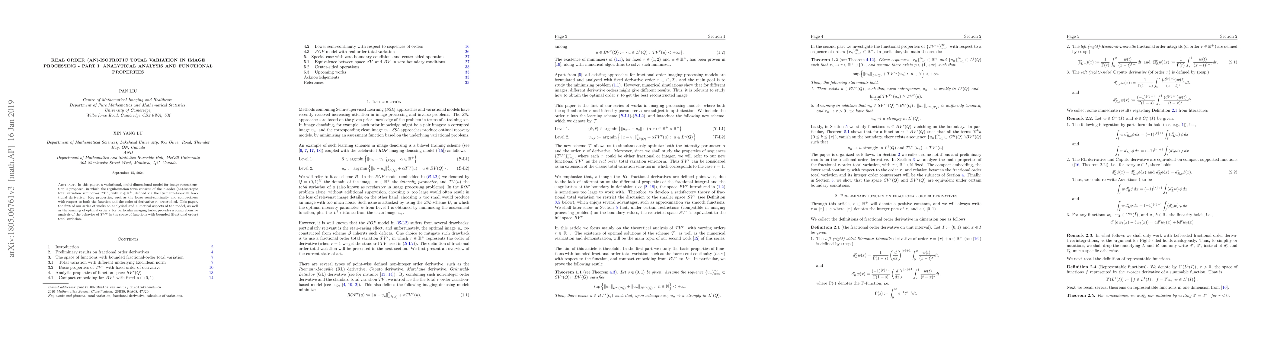 In this paper, a variational, multi-dimensional model for image reconstruction is proposed, in which the regularization term consists of the $r$-order (an)-isotropic total variation seminorms $TV^r$, with $r\in \mathbb R^+$, defined via the Riemann-Liouville fractional derivative. Key properties, such as the lower semi-continuity and compactness with respect to both the function $u$ and the order of derivative $r$, are studied. This paper, the first of our series works on analytical and numerical aspects of the model, as well as the learning of optimal order $r$ for particular imaging tasks, provides a comprehensive analysis of the behavior of $TV^r$ in the space of functions with bounded (fractional order) total variation.
