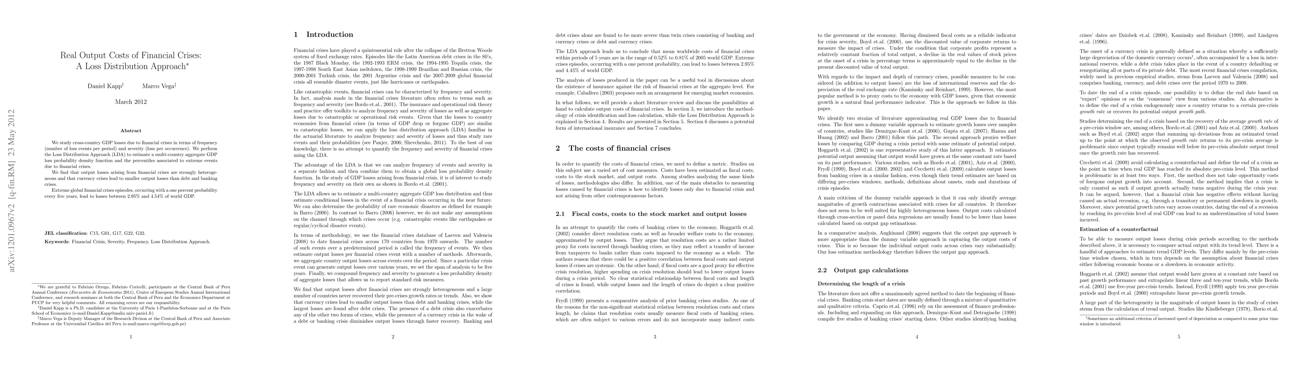 This paper uses the Loss Distribution Approach to estimate GDP losses across countries due to financial crises, finding significant heterogeneity in output losses. It concludes that while currency crises cause smaller losses, extreme global crises could result in losses between 2.95% and 4.54% of world GDP, occurring with a one percent probability every five years.
