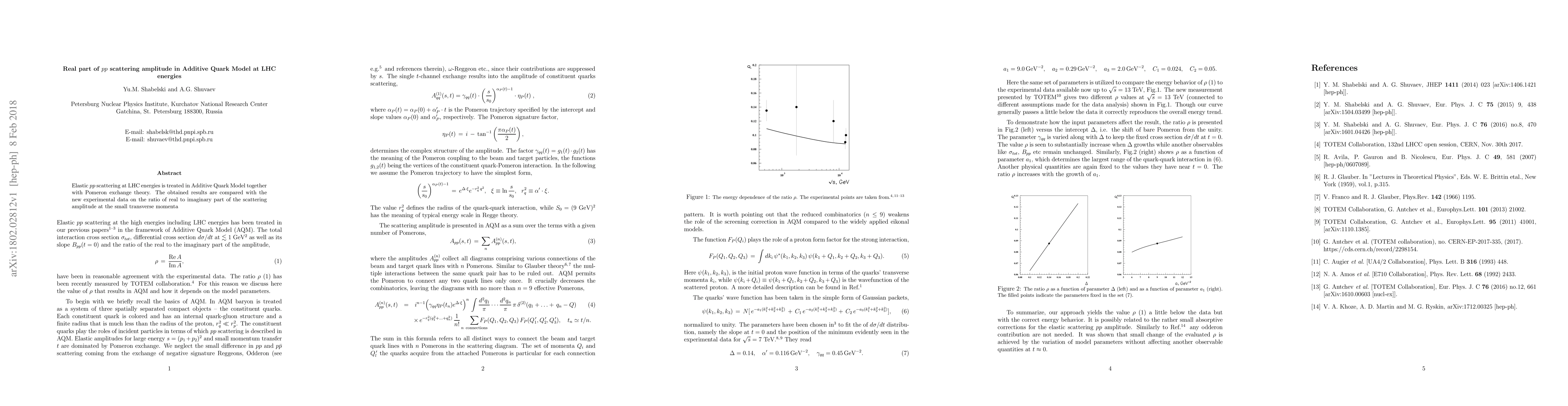 This paper investigates elastic $pp$ scattering at LHC energies using the Additive Quark Model and Pomeron exchange theory, comparing its predictions for the real part of the scattering amplitude with recent experimental data on the ratio of real to imaginary parts at low transverse momenta.