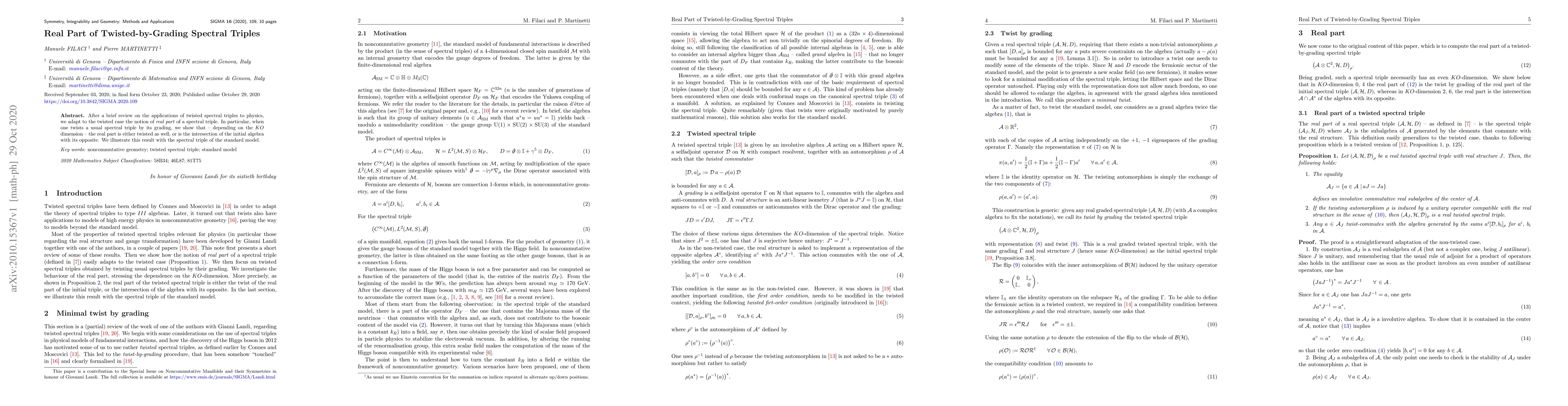 After a brief review on the applications of twisted spectral triples to physics, we adapt to the twisted case the notion of real part of a spectral triple. In particular, when one twists a usual spectral triple by its grading, we show that - depending on the $KO$ dimension - the real part is either twisted as well, or is the intersection of the initial algebra with its opposite. We illustrate this result with the spectral triple of the standard model.