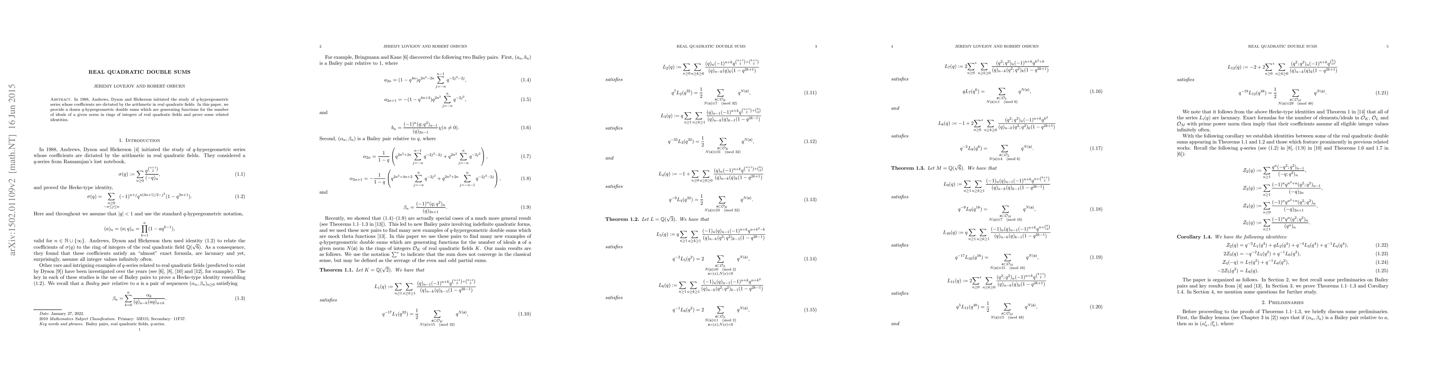 In 1988, Andrews, Dyson and Hickerson initiated the study of q-hypergeometric series whose coefficients are dictated by the arithmetic in real quadratic fields. In this paper, we provide a dozen q-hypergeometric double sums which are generating functions for the number of ideals of a given norm in rings of integers of real quadratic fields and prove some related identities.