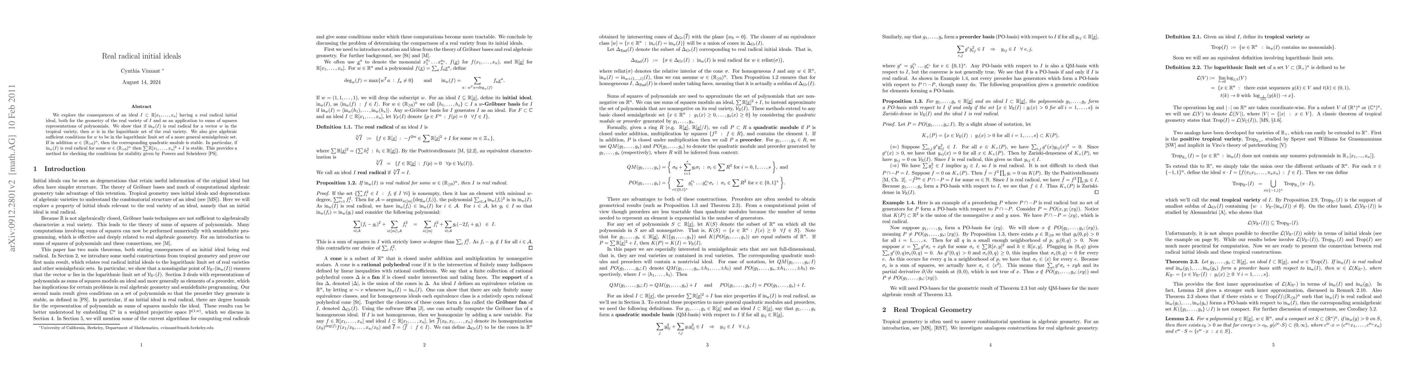 A paper explores how an ideal in real polynomials having a real radical initial ideal affects its geometry and applications to sums of squares representations. It provides conditions for stability of quadratic modules.