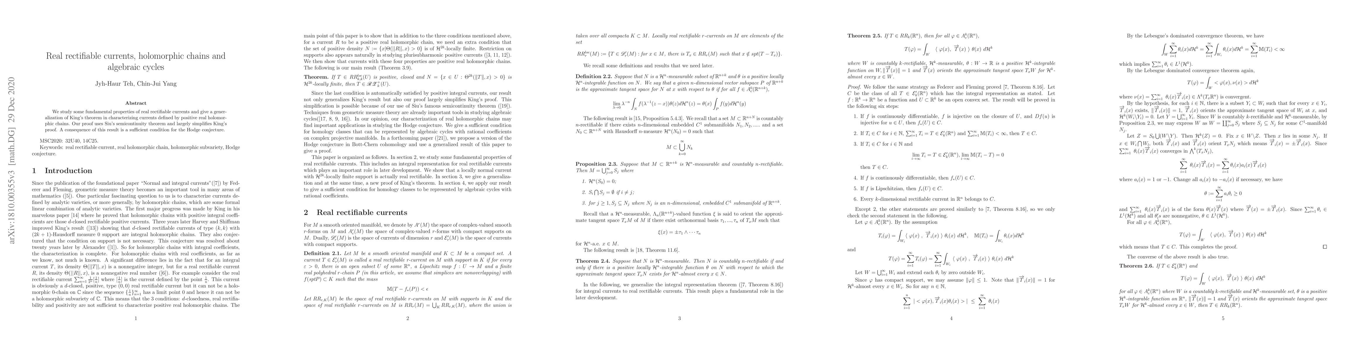 We study some fundamental properties of real rectifiable currents and give a generalization of King's theorem in characterizing currents defined by positive real holomorphic chains. Our proof uses Siu's semicontinuity theorem and largely simplifies King's proof. A consequence of this result is a sufficient condition for the Hodge conjecture.
