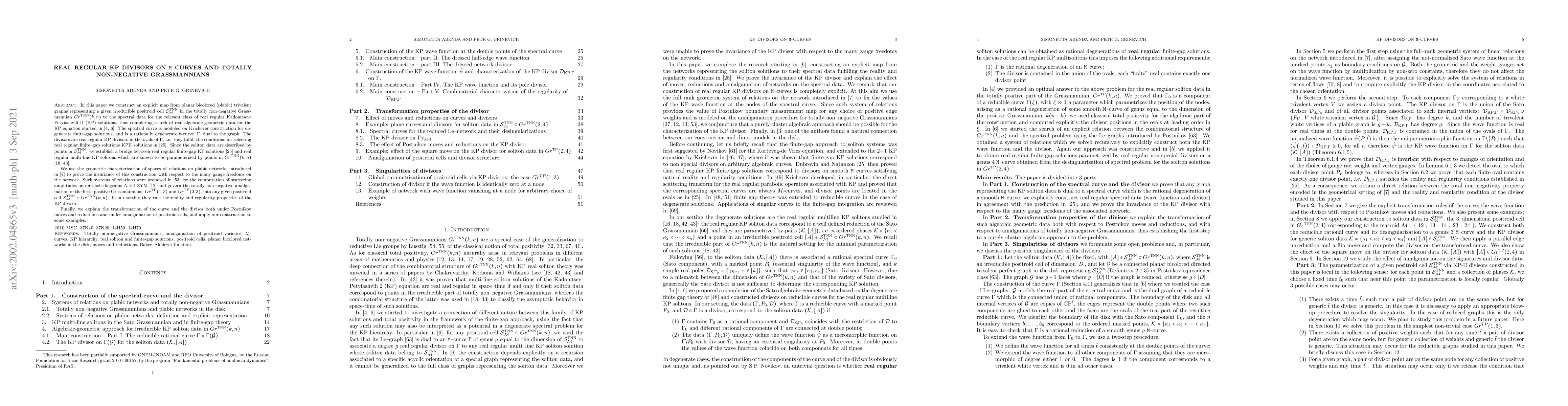 This paper constructs a map from plabic graphs to spectral data for real regular KP solutions, linking them to points in totally non-negative Grassmannians. It establishes a bridge between real regular finite-gap KP solutions and multi-line KP solitons, proving the construction's invariance under gauge freedoms.