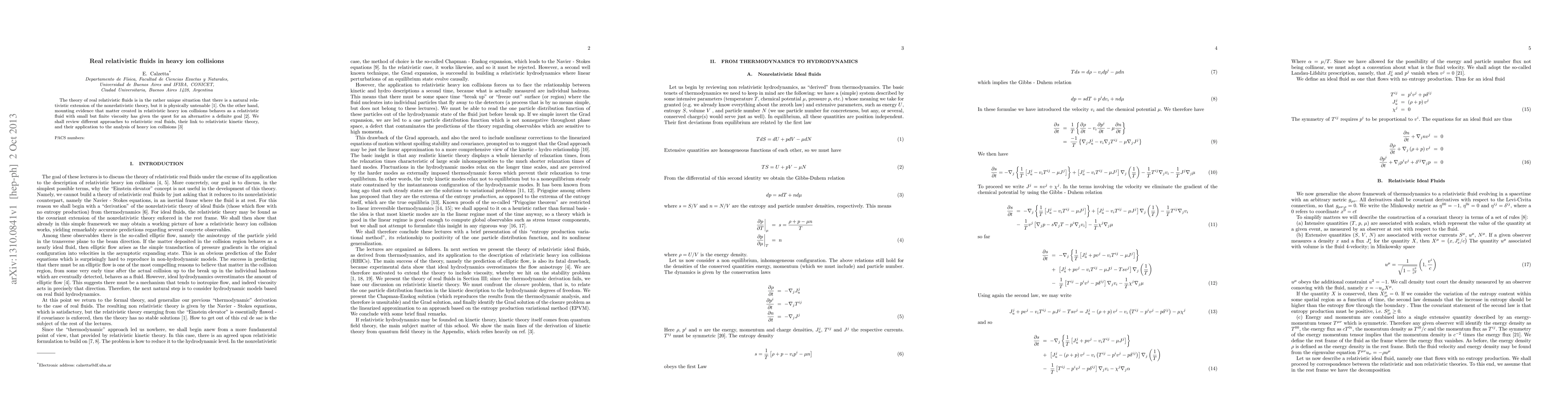 This paper reviews theoretical frameworks for real relativistic fluids, focusing on their relevance to the behavior of matter in relativistic heavy ion collisions, where evidence suggests a fluid-like state with low viscosity, despite the lack of a physically viable relativistic extension of nonrelativistic fluid theory. It discusses various approaches and their applications to collision analysis.