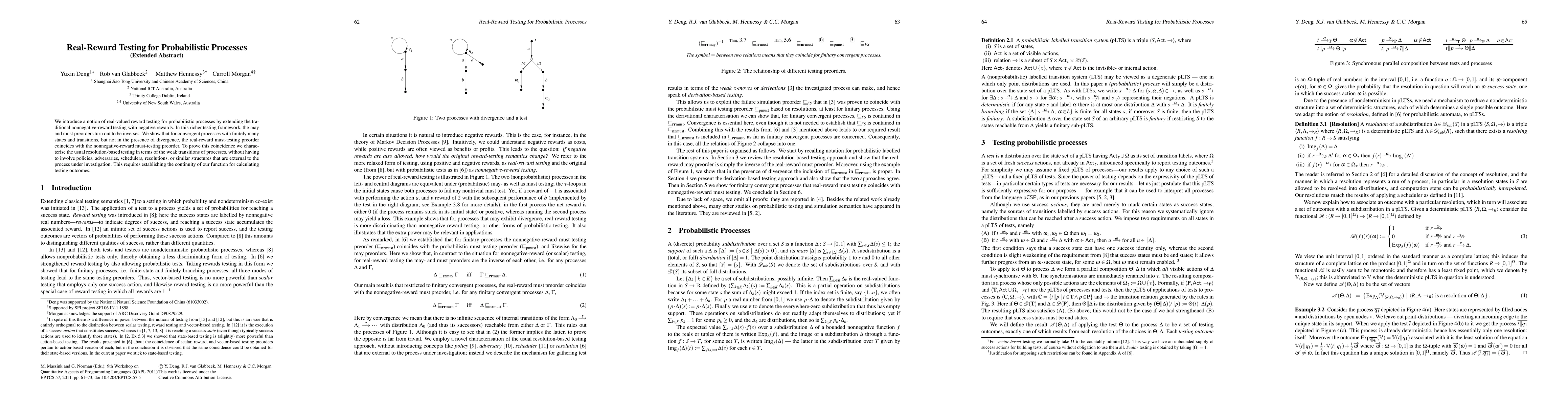 The paper presents a novel testing framework for probabilistic processes using real-valued rewards, characterizes testing outcomes through weak derivations, and proves the equivalence of resolution-based and derivation-based testing approaches for finite convergent processes.