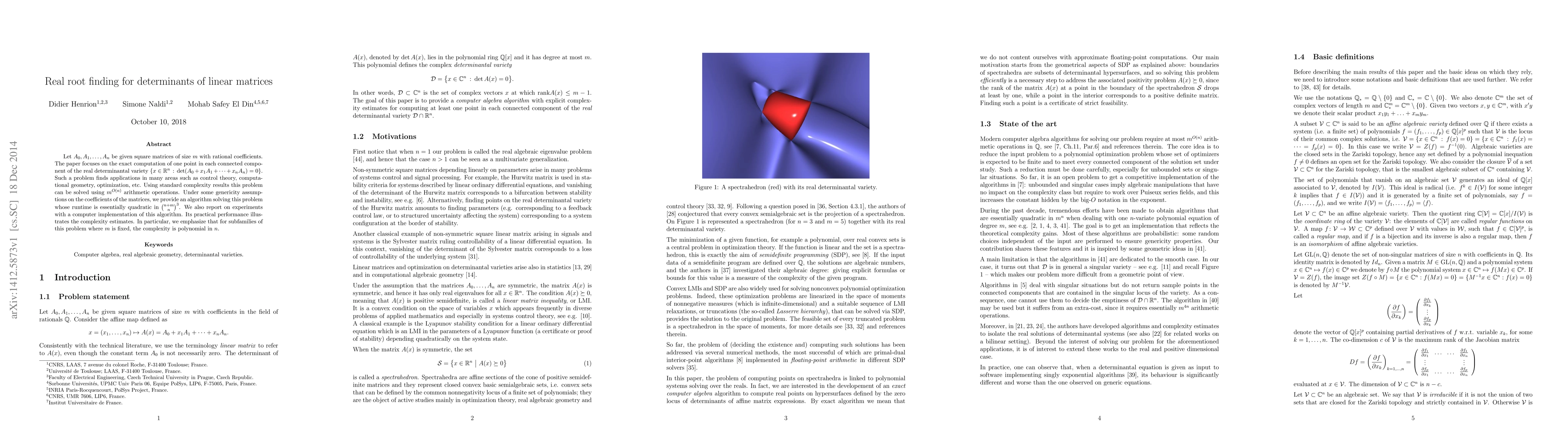 Let $\A_0, \A_1, \ldots, \A_n$ be given square matrices of size $m$ with rational coefficients. The paper focuses on the exact computation of one point in each connected component of the real determinantal variety $\{\X \in\RR^n \: :\: \det(\A_0+x_1\A_1+\cdots+x_n\A_n)=0\}$. Such a problem finds applications in many areas such as control theory, computational geometry, optimization, etc. Using standard complexity results this problem can be solved using $m^{O(n)}$ arithmetic operations. Under some genericity assumptions on the coefficients of the matrices, we provide an algorithm solving this problem whose runtime is essentially quadratic in ${{n+m}\choose{n}}^{3}$. We also report on experiments with a computer implementation of this algorithm. Its practical performance illustrates the complexity estimates. In particular, we emphasize that for subfamilies of this problem where $m$ is fixed, the complexity is polynomial in $n$.