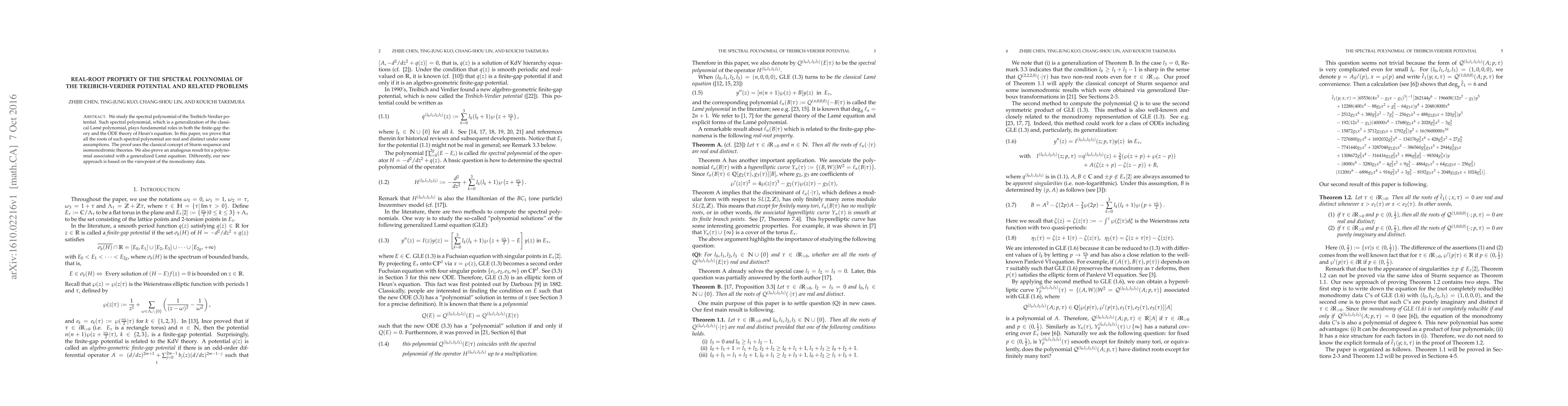 The paper proves that the roots of the spectral polynomial of the Treibich-Verdier potential are real and distinct under certain assumptions, using Sturm sequence and isomonodromic theories.