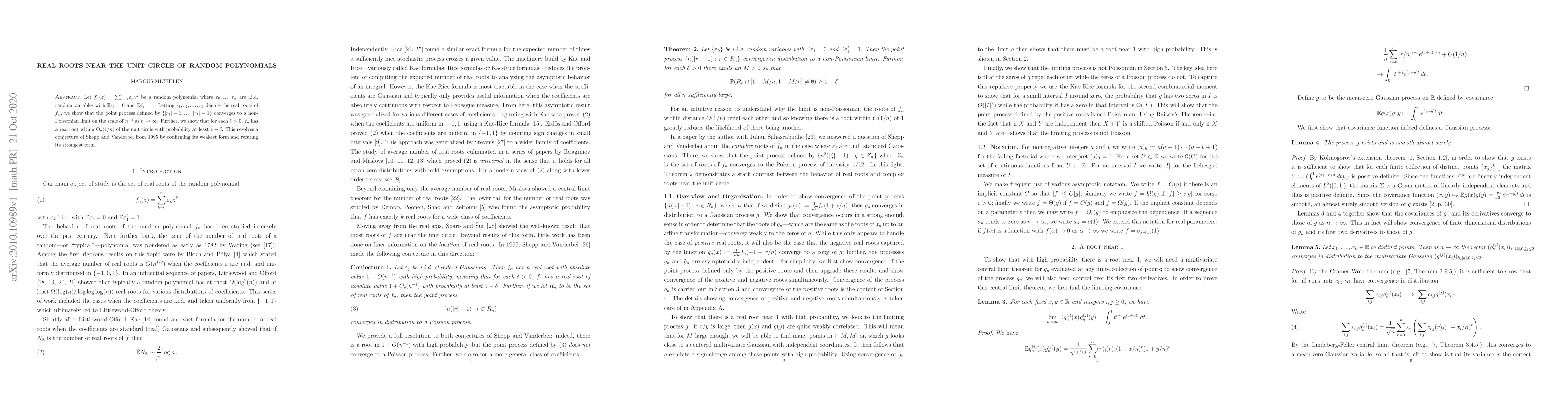 Let $f_n(z) = \sum_{k = 0}^n \varepsilon_k z^k$ be a random polynomial where $\varepsilon_0,\ldots,\varepsilon_n$ are i.i.d. random variables with $\mathbb{E} \varepsilon_1 = 0$ and $\mathbb{E} \varepsilon_1^2 = 1$. Letting $r_1, r_2,\ldots, r_k$ denote the real roots of $f_n$, we show that the point process defined by $\{|r_1| - 1,\ldots, |r_k| - 1 \}$ converges to a non-Poissonian limit on the scale of $n^{-1}$ as $n \to \infty$. Further, we show that for each $\delta > 0$, $f_n$ has a real root within $\Theta_{\delta}(1/n)$ of the unit circle with probability at least $1 - \delta$. This resolves a conjecture of Shepp and Vanderbei from 1995 by confirming its weakest form and refuting its strongest form.