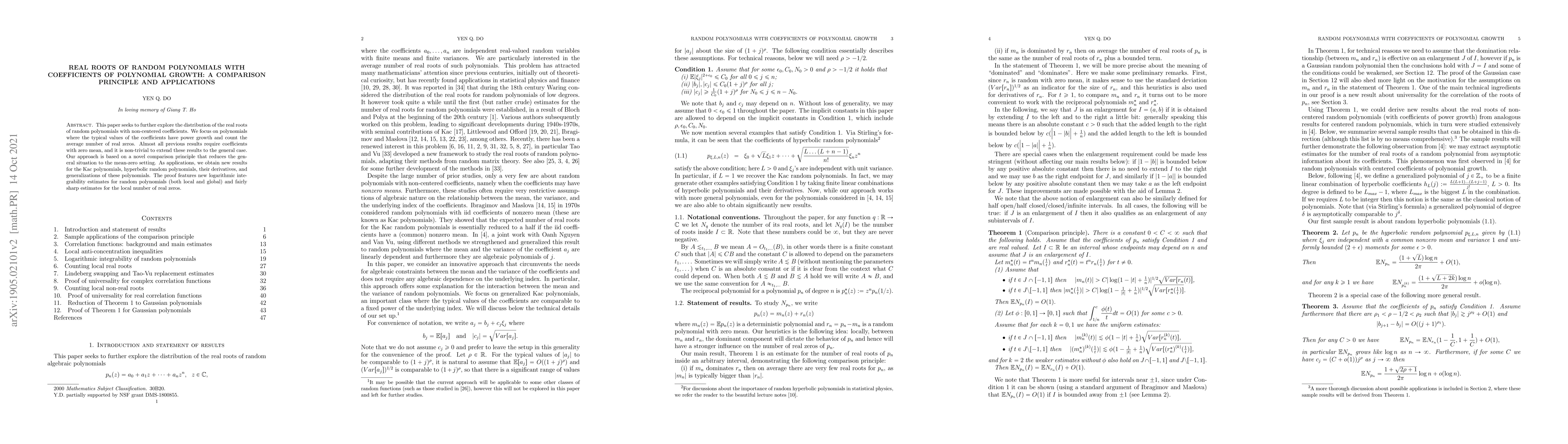 This paper develops a novel comparison principle to analyze the real roots distribution of random polynomials with coefficients exhibiting polynomial growth, extending previous results that assume zero mean. It provides new insights into Kac polynomials, hyperbolic random polynomials, and their derivatives.
