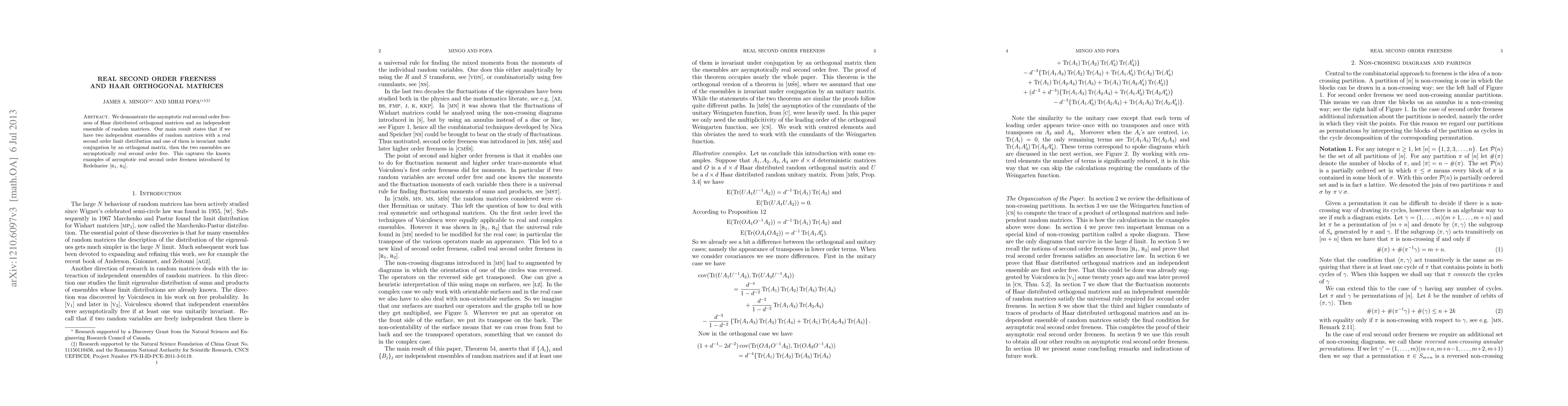 This paper proves the asymptotic real second order freeness of Haar orthogonal matrices and independent random matrix ensembles. It establishes that if two independent random matrix ensembles share a real second order limit distribution and one is invariant under orthogonal conjugation, they are asymptotically real second order free, extending known examples by Redelmeier.
