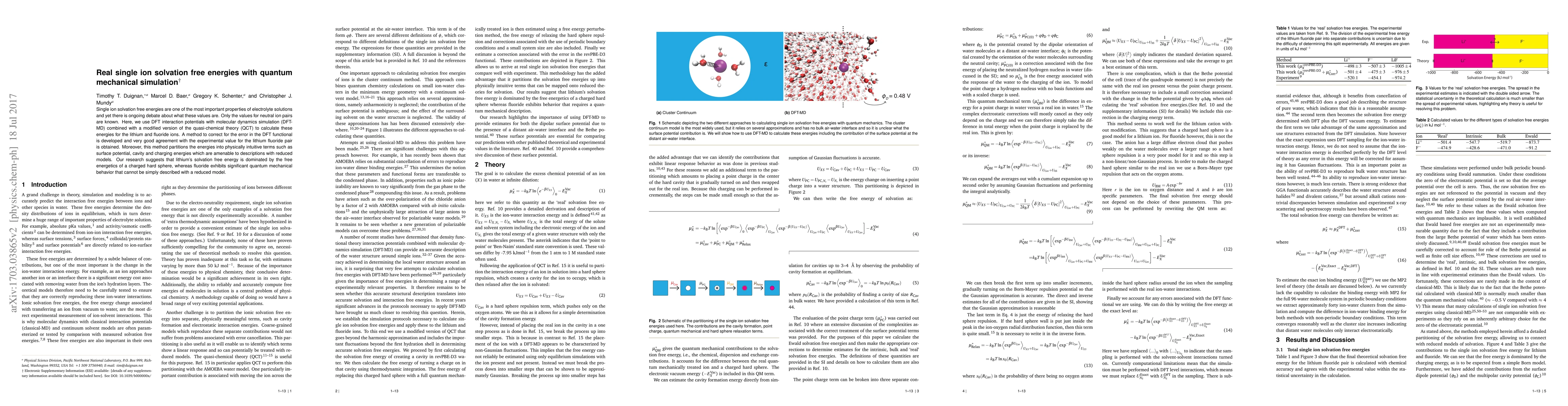 This paper presents a quantum mechanical simulation using DFT-MD and QCT to determine single ion solvation free energies for lithium and fluoride ions, correcting for DFT functional errors and achieving good experimental agreement. It highlights that lithium's solvation is dominated by classical electrostatics, while fluoride's solvation involves significant quantum mechanical effects.