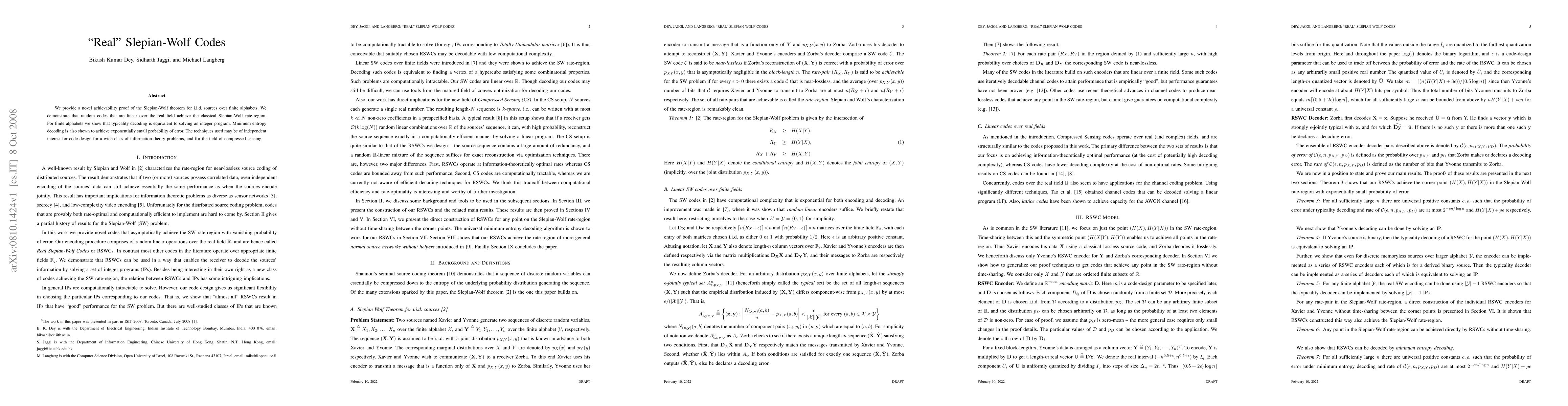 We provide a novel achievability proof of the Slepian-Wolf theorem for i.i.d. sources over finite alphabets. We demonstrate that random codes that are linear over the real field achieve the classical Slepian-Wolf rate-region. For finite alphabets we show that typicality decoding is equivalent to solving an integer program. Minimum entropy decoding is also shown to achieve exponentially small probability of error. The techniques used may be of independent interest for code design for a wide class of information theory problems, and for the field of compressed sensing.