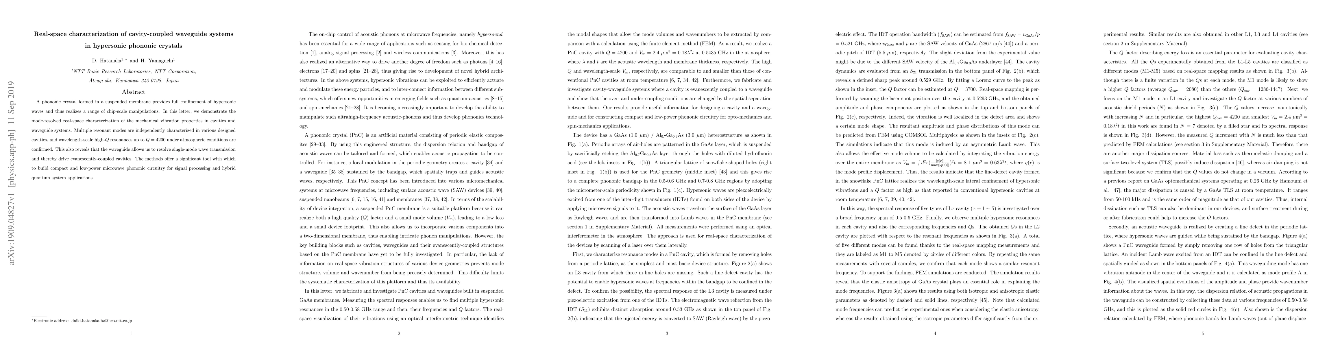 A phononic crystal formed in a suspended membrane provides full confinement of hypersonic waves and thus realizes a range of chip-scale manipulations. In this letter, we demonstrate the mode-resolved real-space characterization of the mechanical vibration properties in cavities and waveguide systems. Multiple resonant modes are independently characterized in various designed cavities, and wavelength-scale high-$Q$ resonances up to $Q=$ 4200 under atmospheric conditions are confirmed. This also reveals that the waveguide allows us to resolve single-mode wave transmission and thereby drive evanescently-coupled cavities. The methods offer a significant tool with which to build compact and low-power microwave phononic circuitry for signal processing and hybrid quantum system applications.