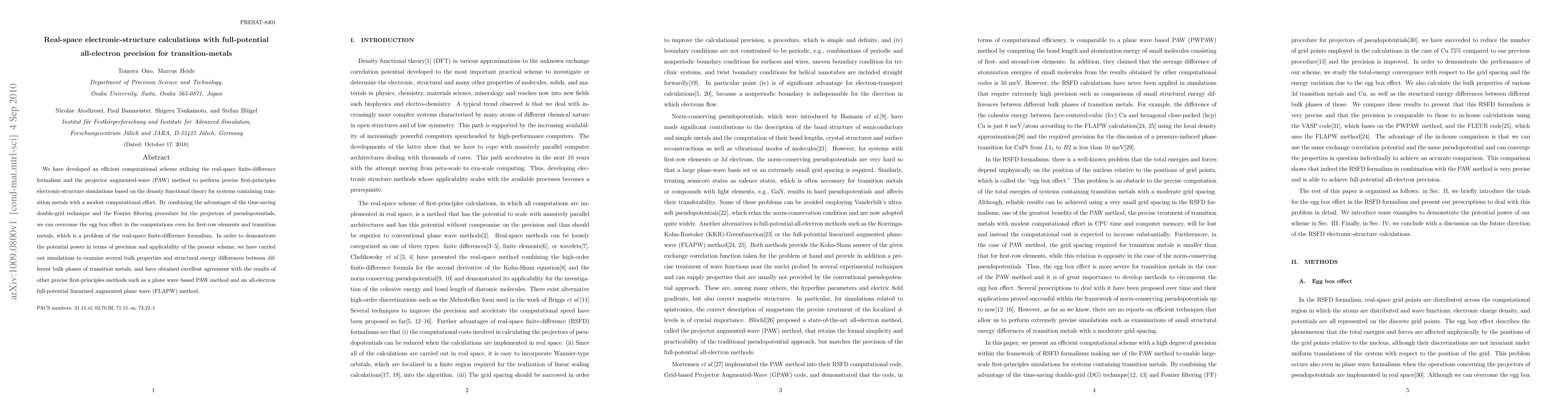 This paper introduces a new computational scheme for precise electronic-structure calculations of transition metals using real-space finite-difference and PAW methods, achieving high accuracy with modest computational effort. The method effectively addresses the egg box effect and demonstrates excellent agreement with other first-principles methods for various bulk properties and structural energy differences.