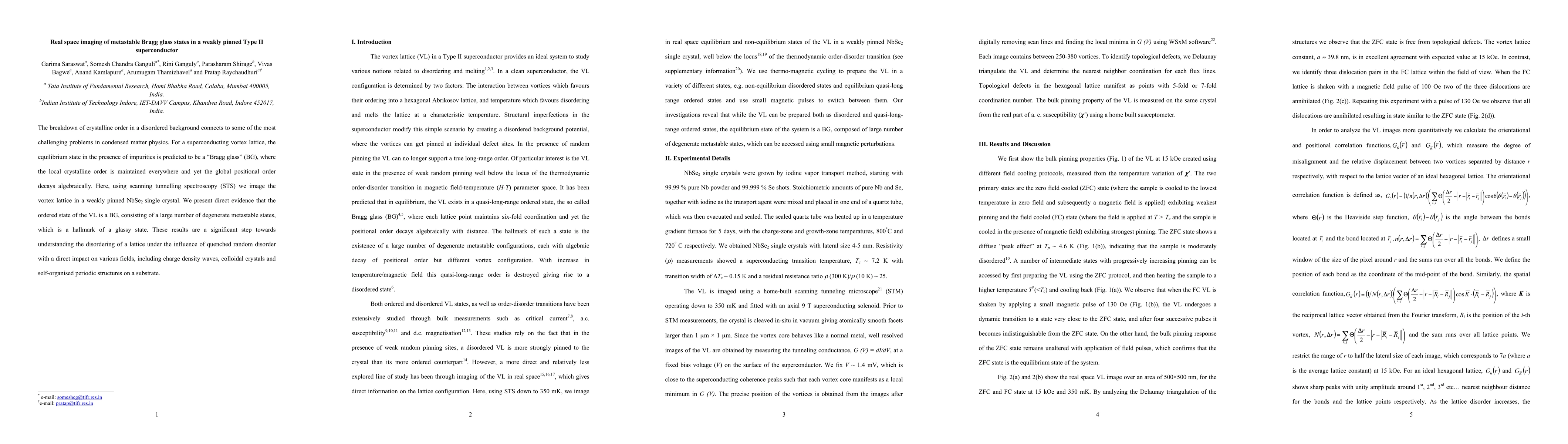 This paper presents direct imaging of metastable Bragg glass states in a weakly pinned Type II superconductor using scanning tunnelling spectroscopy, revealing a lattice of superconducting vortices that maintains local order but lacks global positional order, indicative of a glassy state. These findings advance understanding of disordering in lattice systems influenced by quenched random disorder.
