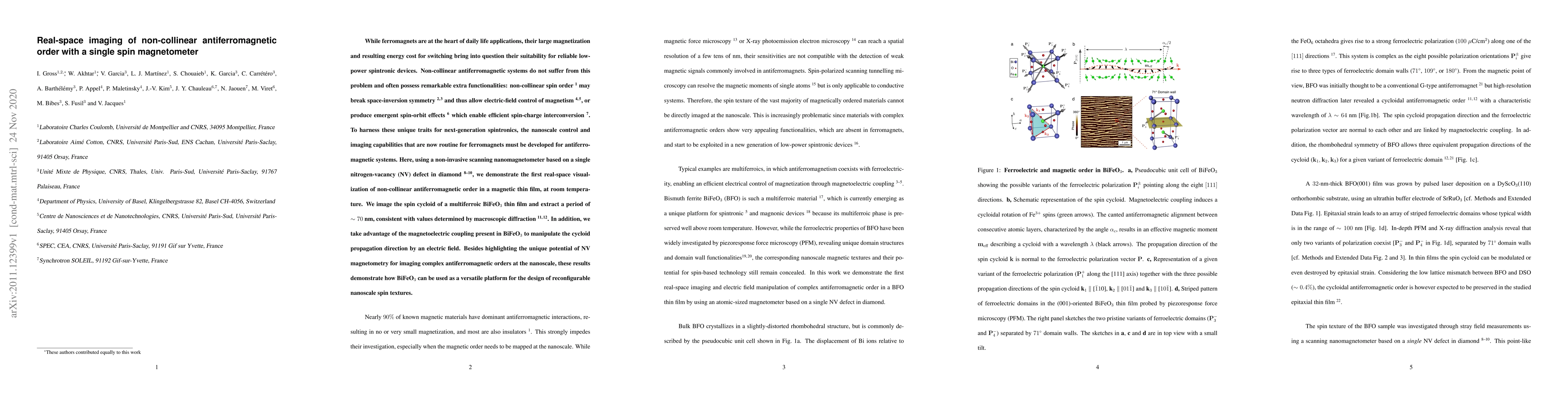 This paper demonstrates the first real-space imaging of non-collinear antiferromagnetic order using a scanning nanomagnetometer based on a single nitrogen-vacancy defect in diamond. The study visualizes the spin cycloid in a BiFeO$_3$ thin film at room temperature, showcasing its potential for next-generation spintronics and reconfigurable nanoscale spin textures.