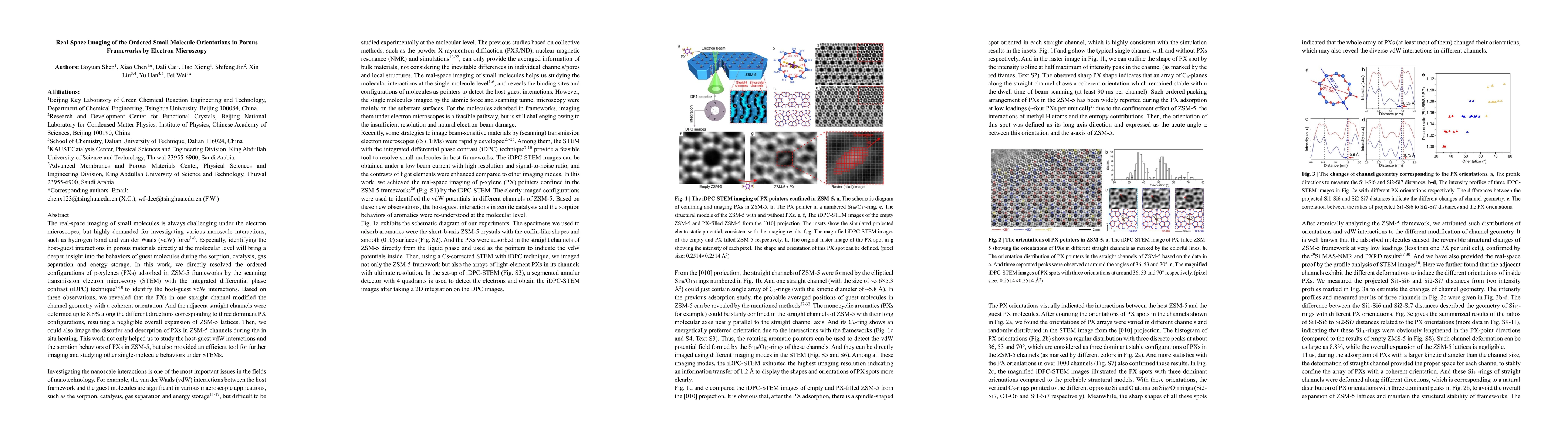 This paper presents a method using scanning transmission electron microscopy (STEM) with integrated differential phase contrast (iDPC) to directly image the ordered orientations of p-xylenes in ZSM-5 frameworks, revealing host-guest van der Waals interactions and the deformation of channel geometry due to molecular adsorption. The study also demonstrates the technique's capability to observe the disorder and desorption of molecules under in situ heating.
