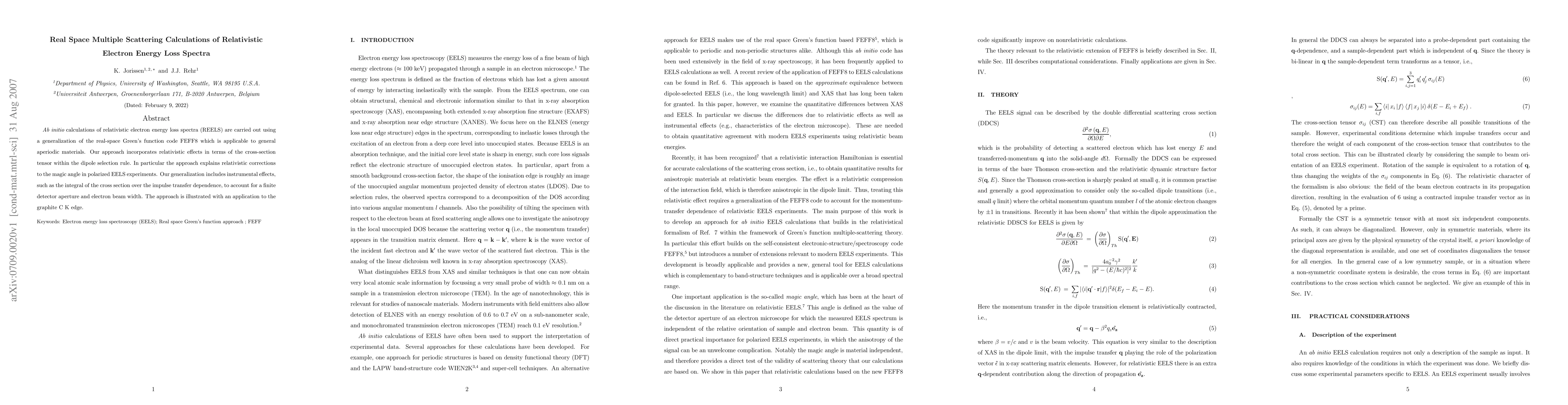 This paper presents an ab initio method for calculating relativistic electron energy loss spectra using a generalized real-space multiple scattering code. The method accounts for relativistic effects, explains corrections to the magic angle in polarized EELS, and includes instrumental effects, demonstrated through an application to the graphite C K edge.