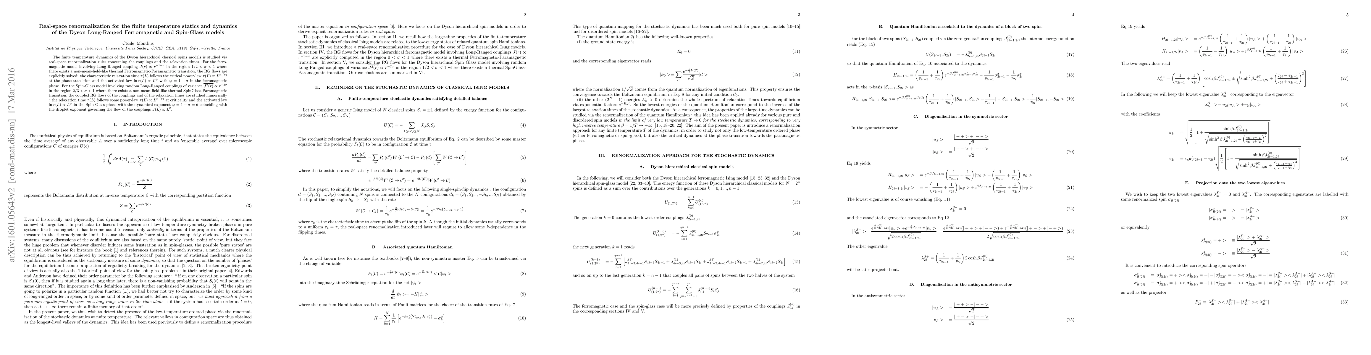 This paper investigates the finite temperature dynamics of Dyson hierarchical classical spin models using real-space renormalization. It finds power-law behaviors for relaxation times at phase transitions in both ferromagnetic and spin-glass models, with exponents dependent on the range parameter $\sigma$.