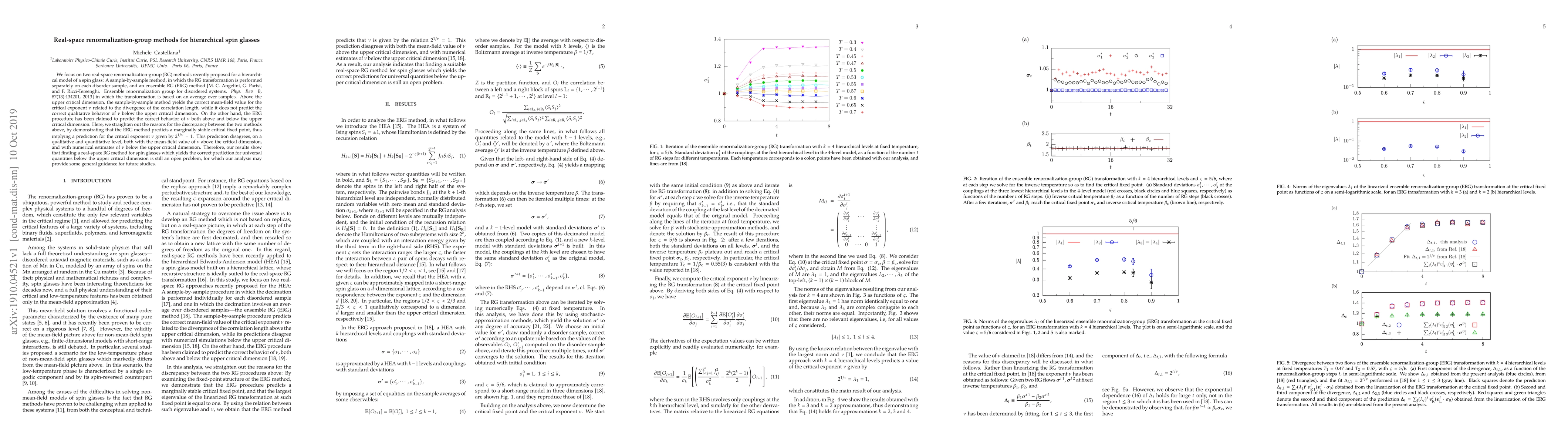 This paper investigates two real-space renormalization-group methods for hierarchical spin glasses, finding that while the sample-by-sample method correctly predicts mean-field behavior above the upper critical dimension, the ensemble RG method incorrectly predicts a critical exponent $\nu$ that does not match numerical estimates or mean-field values. The study highlights the ongoing challenge of accurately predicting universal quantities below the upper critical dimension.