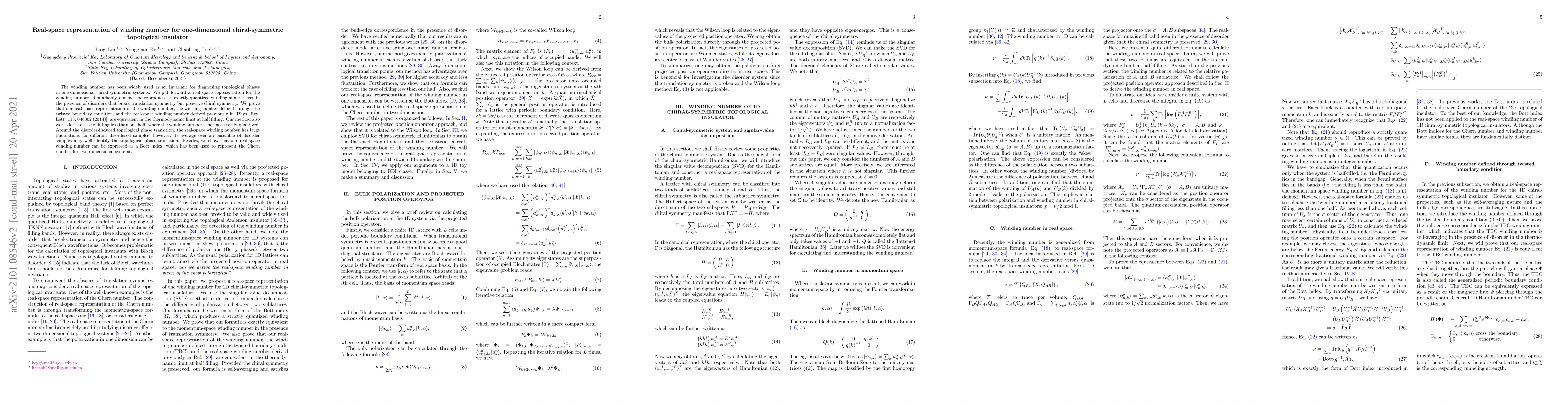 The winding number has been widely used as an invariant for diagnosing topological phases in one-dimensional chiral-symmetric systems. We put forward a real-space representation for the winding number. Remarkably, our method reproduces an exactly quantized winding number even in the presence of disorders that break translation symmetry but preserve chiral symmetry. We prove that our real-space representation of the winding number, the winding number defined through the twisted boundary condition, and the real-space winding number derived previously in [Phys. Rev. Lett. 113, 046802 (2014)], are equivalent in the thermodynamic limit at half filling. Our method also works for the case of filling less than one half, where the winding number is not necessarily quantized. Around the disorder-induced topological phase transition, the real-space winding number has large fluctuations for different disordered samples, however, its average over an ensemble of disorder samples may well identify the topological phase transition. Besides, we show that our real-space winding number can be expressed as a Bott index, which has been used to represent the Chern number for two-dimensional systems.