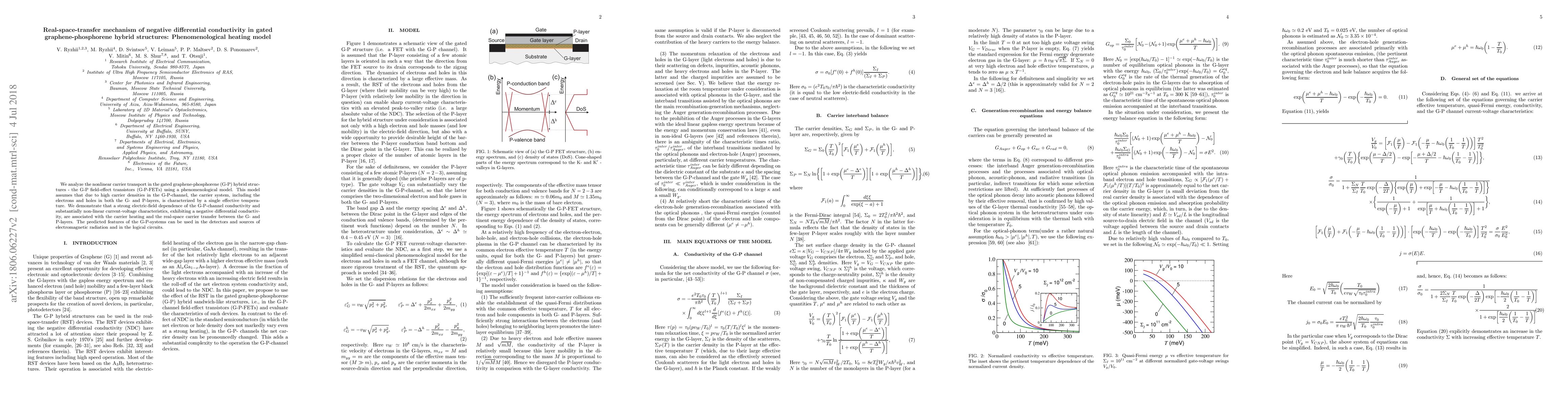 We analyze the nonlinear carrier transport in the gated graphene-phosphorene (G-P) hybrid structures - the G-P field-effect transistors (G-P-FETs) using a phenomenological model. This model assumes that due to high carrier densities in the G-P-channel, the carrier system, including the electrons and holes in both the G- and P-layers, is characterized by a single effective temperature. We demonstrate that a strong electric-field dependence of the G-P-channel conductivity and substantially non-linear current-voltage characteristics, exhibiting a negative differential conductivity, are associated with the carrier heating and the real-space carrier transfer between the G- and P-layers. The predicted features of the G-P-systems can be used in the detectors and sources of electromagnetic radiation and in the logical circuits.