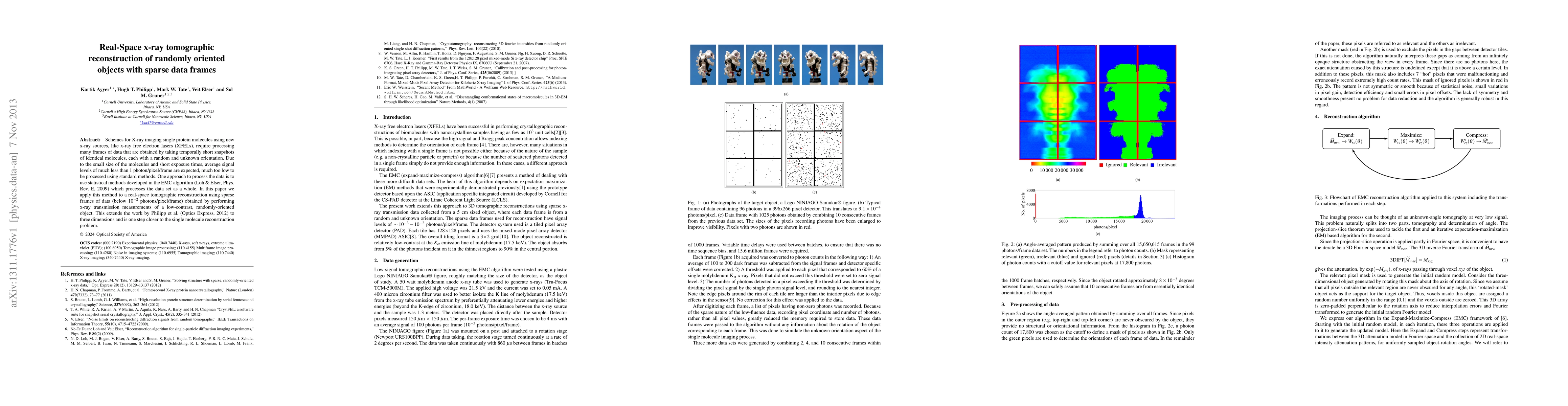 This paper presents a method for reconstructing real-space x-ray tomographic images of randomly oriented objects using sparse data frames, employing the EMC algorithm to process data with extremely low photon counts. This approach extends previous three-dimensional reconstruction techniques and moves closer to solving the single molecule imaging problem using x-ray free electron lasers.