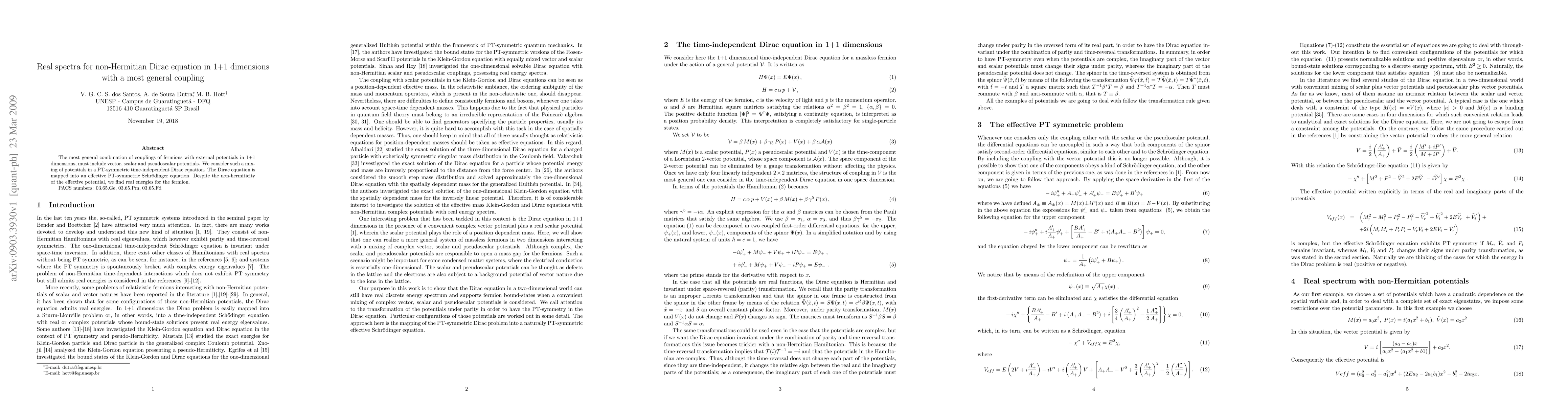 The most general combination of couplings of fermions with external potentials in 1+1 dimensions, must include vector, scalar and pseudoscalar potentials. We consider such a mixing of potentials in a PT-symmetric time-independent Dirac equation. The Dirac equation is mapped into an effective PT-symmetric Schr\"{o}dinger equation. Despite the non-hermiticity of the effective potential, we find real energies for the fermion.