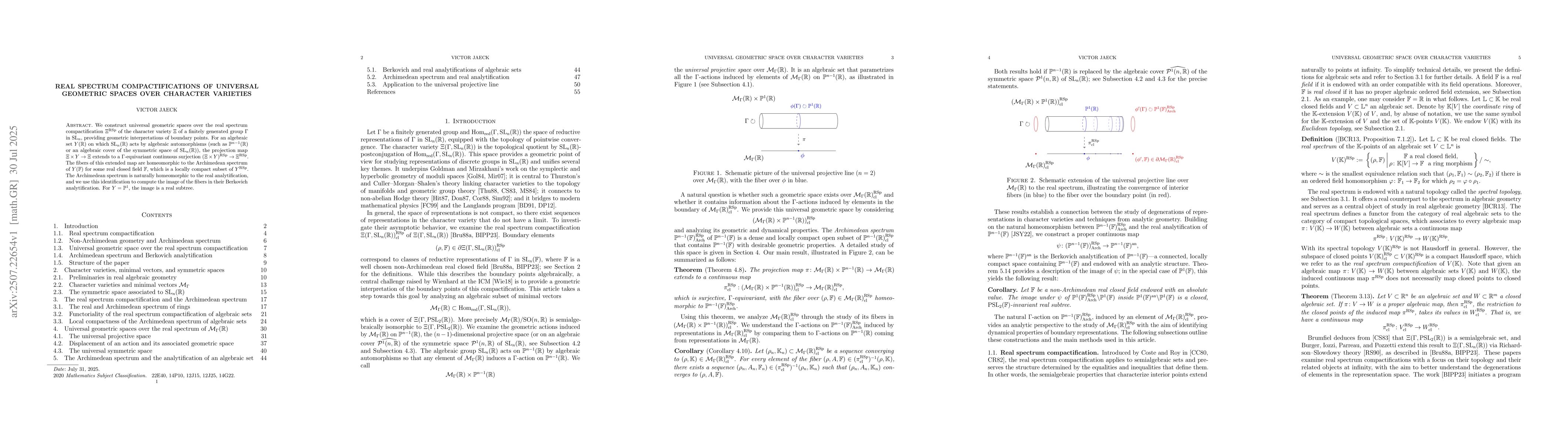 The paper constructs universal geometric spaces over the real spectrum compactification of character varieties of finitely generated groups in SL_n, providing geometric interpretations of boundary points. It extends projection maps to the real spectrum, ensuring fibers are homeomorphic to the Archimedean spectrum of algebraic sets over real closed fields.