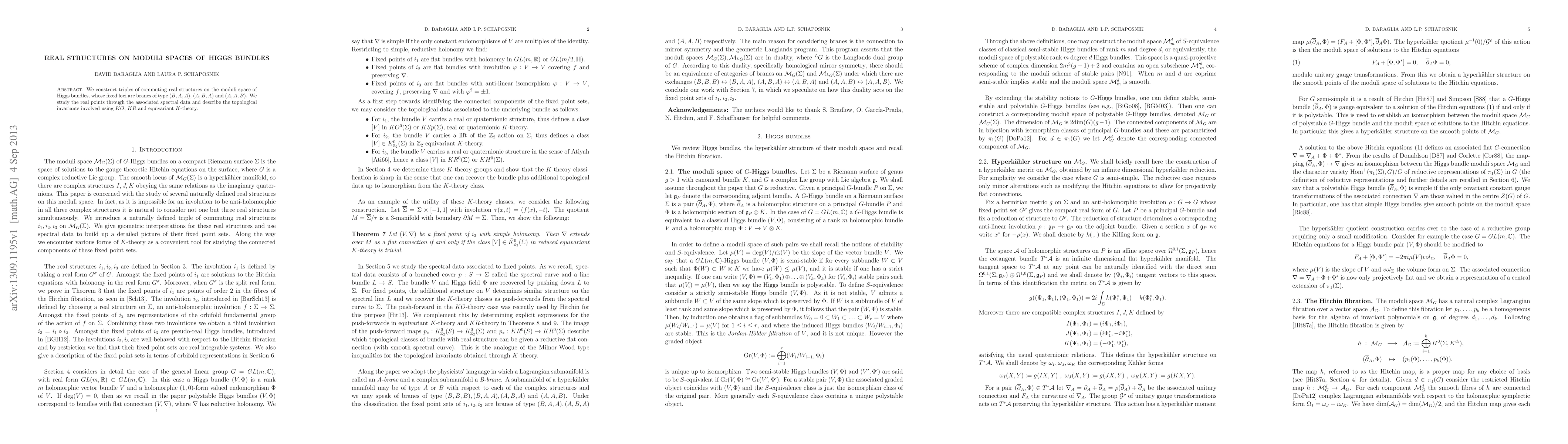 This paper constructs triples of commuting real structures on the moduli space of Higgs bundles, identifying fixed loci as branes of types (B, A, A), (A, B, A), and (A, A, B). It uses KO, KR, and equivariant K-theory to describe the associated topological invariants.