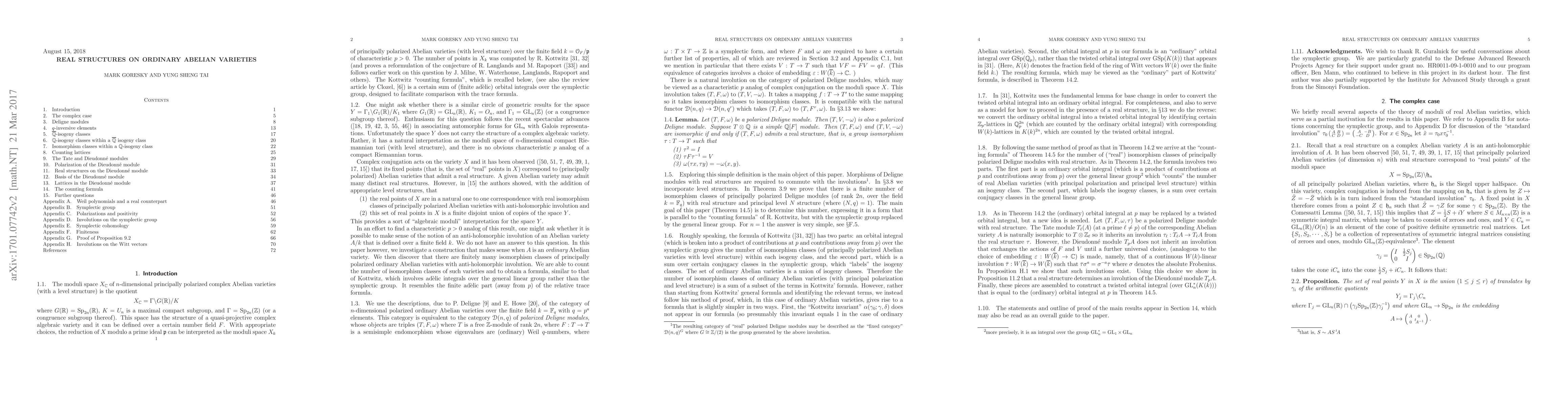 The authors define an "anti-holomorphic" involution (or "real structure") on an ordinary Abelian variety (defined over a finite field k) to be an involution of the associated Deligne module (T,F,V) that exchanges F (the Frobenius) with V (the Verschiebung). The definition extends to include principal polarizations and certain level structures. The authors show there are finitely many isomorphism classes in each dimension, and they give a formula for this number which resembles the Kottwitz "counting formula" (for the number of principally polarized Abelian varieties over k), where the symplectic group (in the Kottwitz formula) has been replaced by the general linear group.
