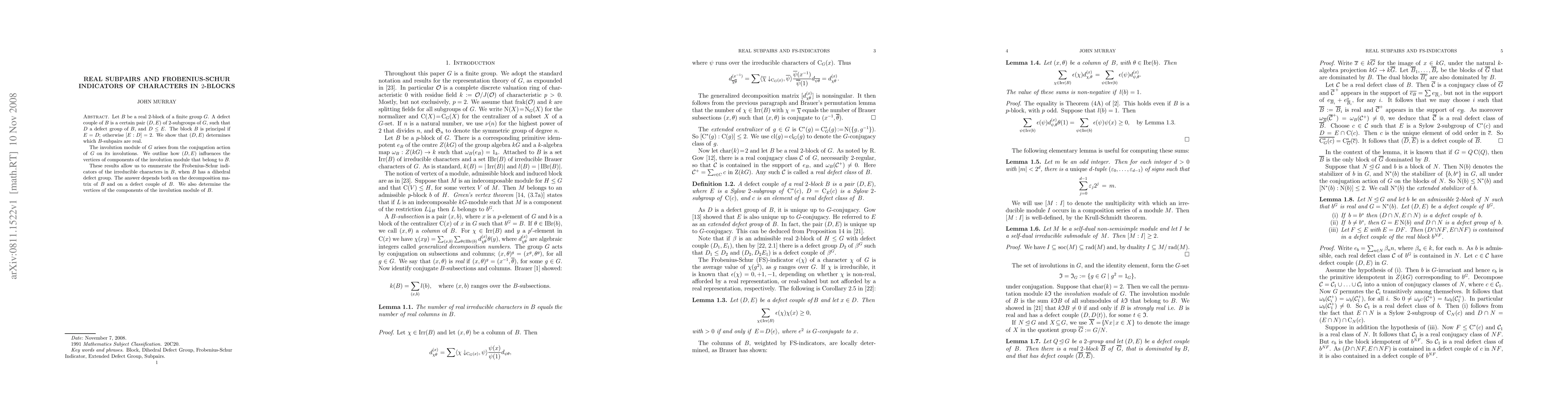 This paper explores the relationship between defect couples in real 2-blocks of finite groups and real subpairs, demonstrating that these couples determine which subpairs are real. It also analyzes how these couples influence component vertices in the G-permutation module and enumerates Frobenius-Schur indicators for characters in real blocks with dihedral defect groups.