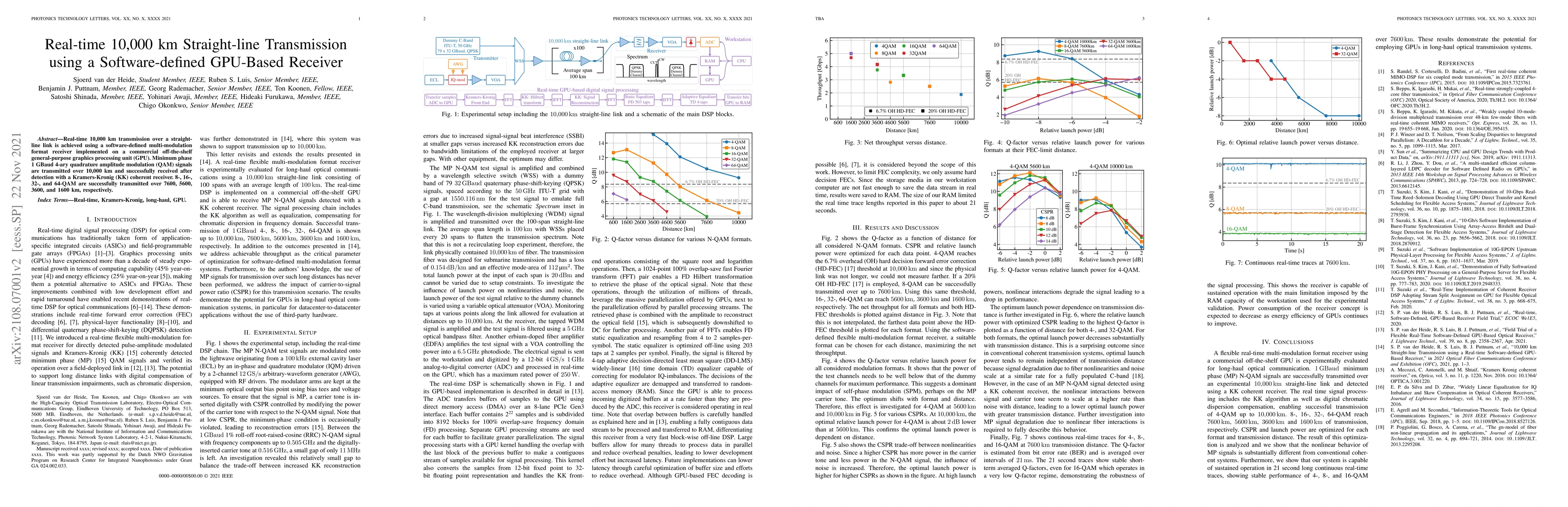 This paper demonstrates real-time transmission of 10,000 km straight-line signals using a software-defined GPU-based receiver, successfully detecting minimum phase 1 GBaud 4-ary QAM and various higher-order QAM formats over progressively shorter distances.