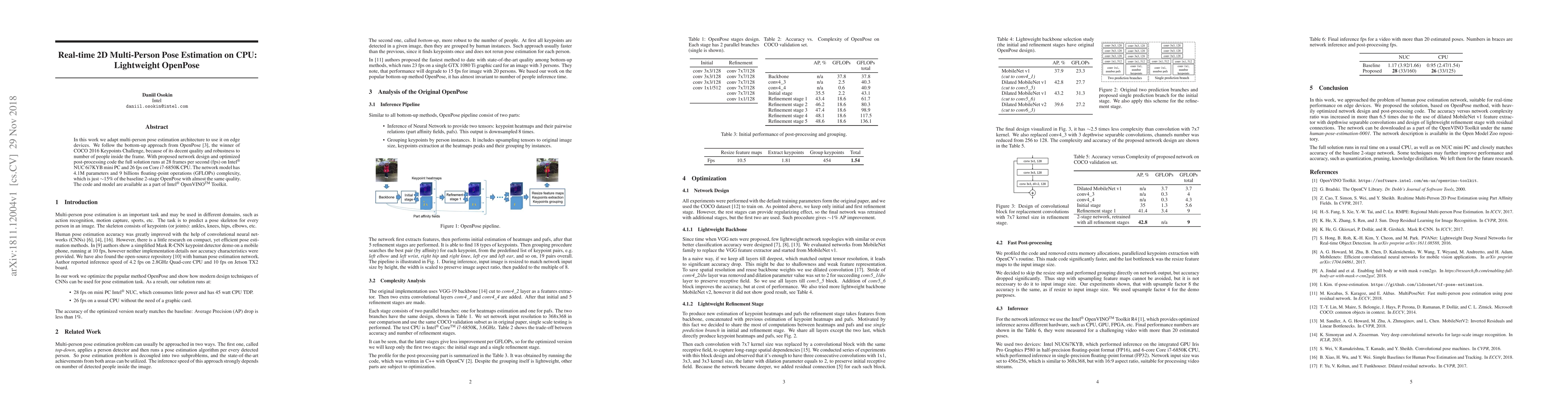 In this work we adapt multi-person pose estimation architecture to use it on edge devices. We follow the bottom-up approach from OpenPose, the winner of COCO 2016 Keypoints Challenge, because of its decent quality and robustness to number of people inside the frame. With proposed network design and optimized post-processing code the full solution runs at 28 frames per second (fps) on Intel$\unicode{xAE}$ NUC 6i7KYB mini PC and 26 fps on Core$^{TM}$ i7-6850K CPU. The network model has 4.1M parameters and 9 billions floating-point operations (GFLOPs) complexity, which is just ~15% of the baseline 2-stage OpenPose with almost the same quality. The code and model are available as a part of Intel$\unicode{xAE}$ OpenVINO$^{TM}$ Toolkit.