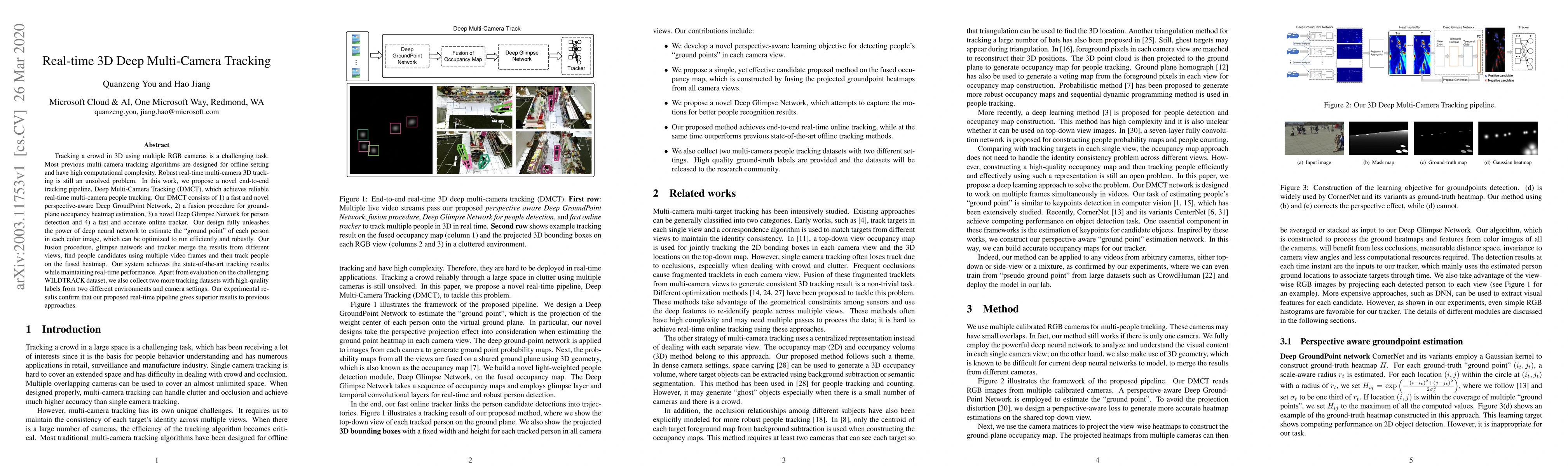 Tracking a crowd in 3D using multiple RGB cameras is a challenging task. Most previous multi-camera tracking algorithms are designed for offline setting and have high computational complexity. Robust real-time multi-camera 3D tracking is still an unsolved problem. In this work, we propose a novel end-to-end tracking pipeline, Deep Multi-Camera Tracking (DMCT), which achieves reliable real-time multi-camera people tracking. Our DMCT consists of 1) a fast and novel perspective-aware Deep GroudPoint Network, 2) a fusion procedure for ground-plane occupancy heatmap estimation, 3) a novel Deep Glimpse Network for person detection and 4) a fast and accurate online tracker. Our design fully unleashes the power of deep neural network to estimate the "ground point" of each person in each color image, which can be optimized to run efficiently and robustly. Our fusion procedure, glimpse network and tracker merge the results from different views, find people candidates using multiple video frames and then track people on the fused heatmap. Our system achieves the state-of-the-art tracking results while maintaining real-time performance. Apart from evaluation on the challenging WILDTRACK dataset, we also collect two more tracking datasets with high-quality labels from two different environments and camera settings. Our experimental results confirm that our proposed real-time pipeline gives superior results to previous approaches.