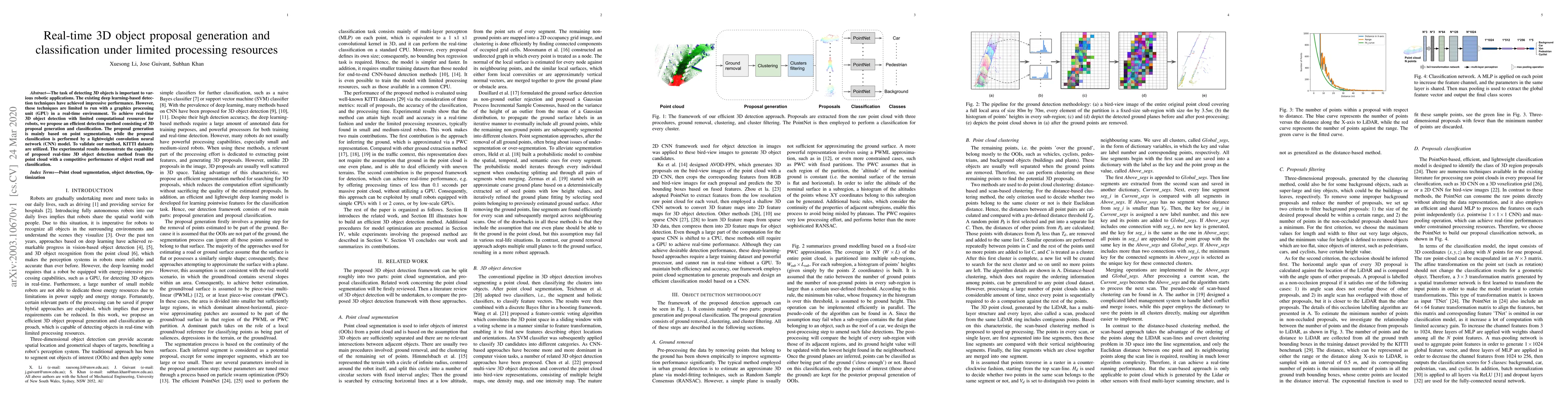 This paper proposes an efficient method for real-time 3D object detection using limited computational resources, employing point segmentation for proposal generation and a lightweight CNN for classification. Experiments on KITTI datasets demonstrate competitive performance in object recall and classification.