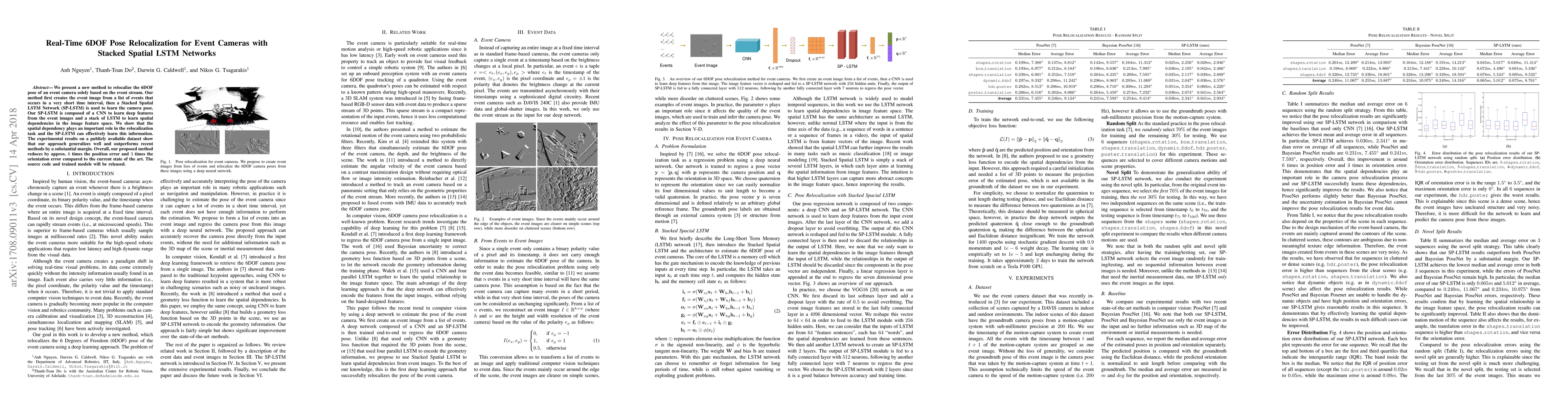 This paper proposes a novel method for real-time 6DOF pose relocalization using event cameras, utilizing a Stacked Spatial LSTM Network (SP-LSTM) that combines CNN and LSTM layers to learn spatial dependencies from event streams. The method significantly outperforms existing techniques, reducing position and orientation errors by approximately 6 times and 3 times respectively.