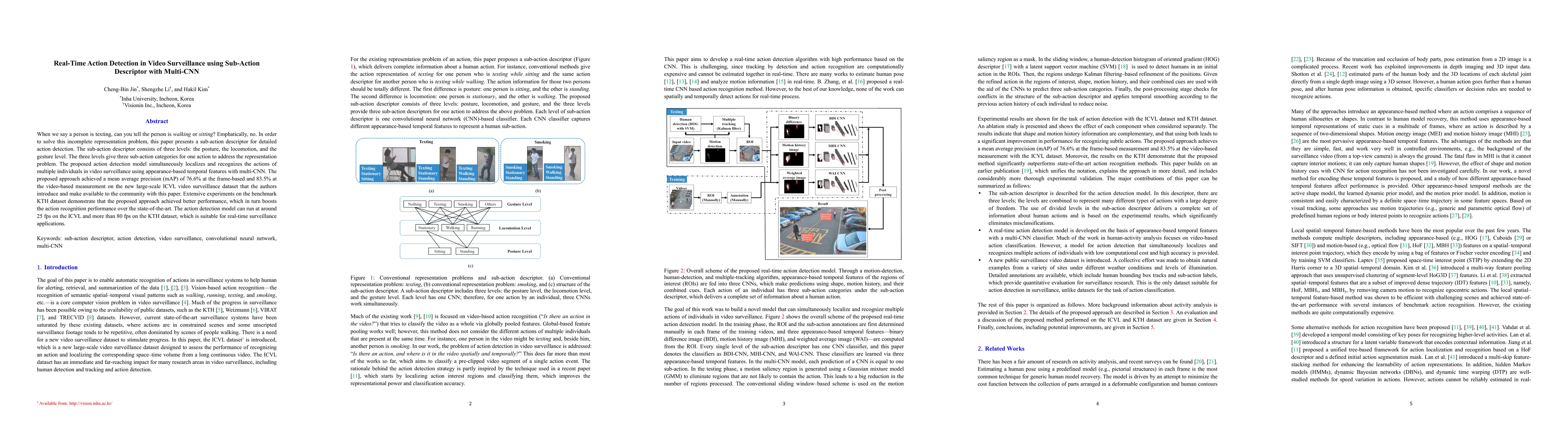 This paper introduces a sub-action descriptor with three levels to improve action detection in video surveillance, achieving a mean average precision of 76.6% at frame-based and 83.5% at video-based levels on a new dataset. The multi-CNN model can detect actions in real-time at over 80 fps.