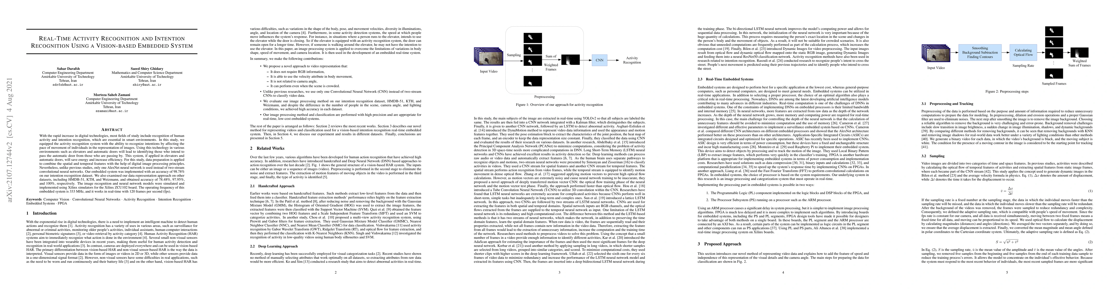 This paper presents a vision-based embedded system for real-time activity and intention recognition using a single AlexNet neural network, achieving 98.78% accuracy on a custom dataset. The system demonstrates high accuracy across various datasets and operates at 333 MHz with 120 fps, promising energy savings and efficiency in smart environments like elevators and automatic doors.
